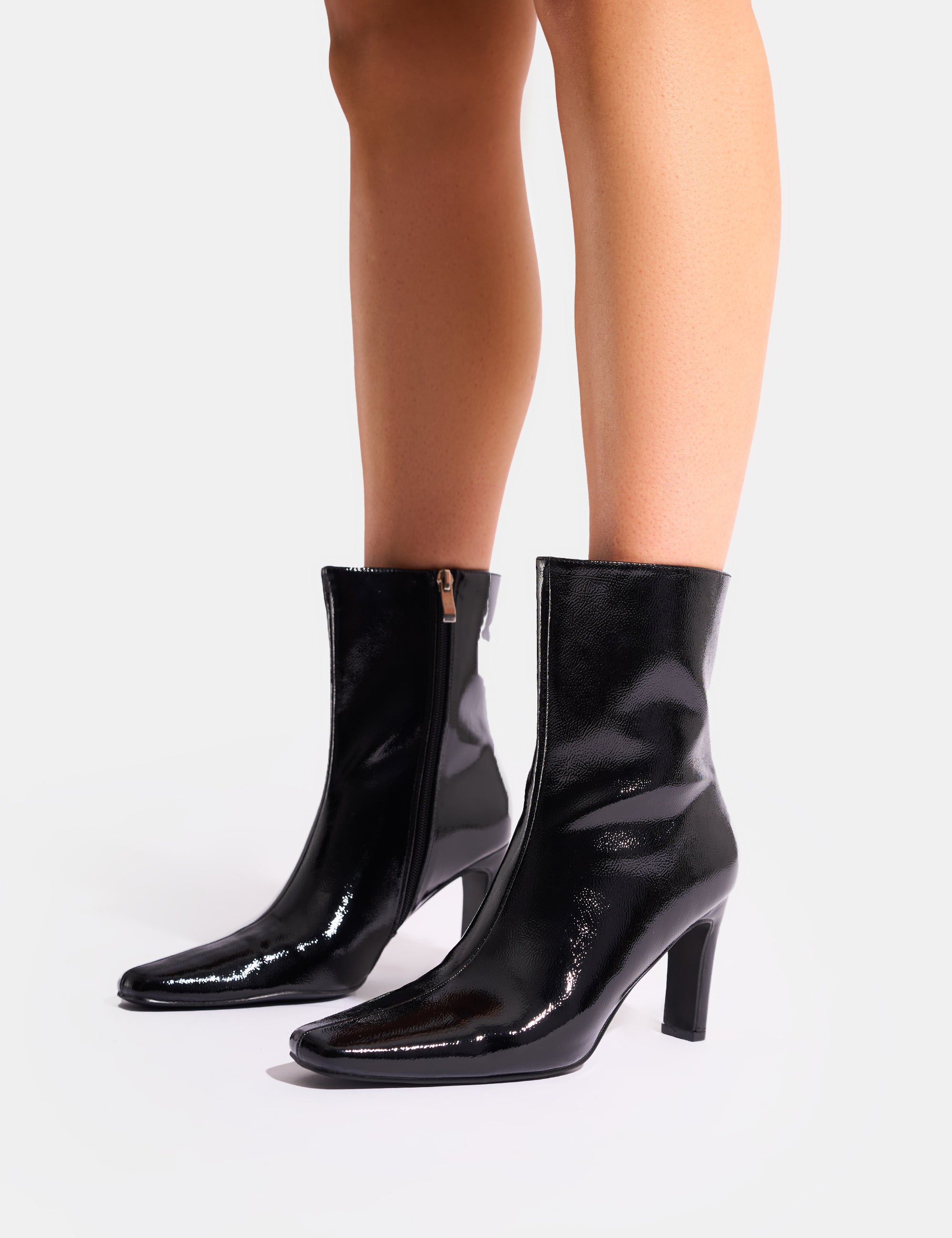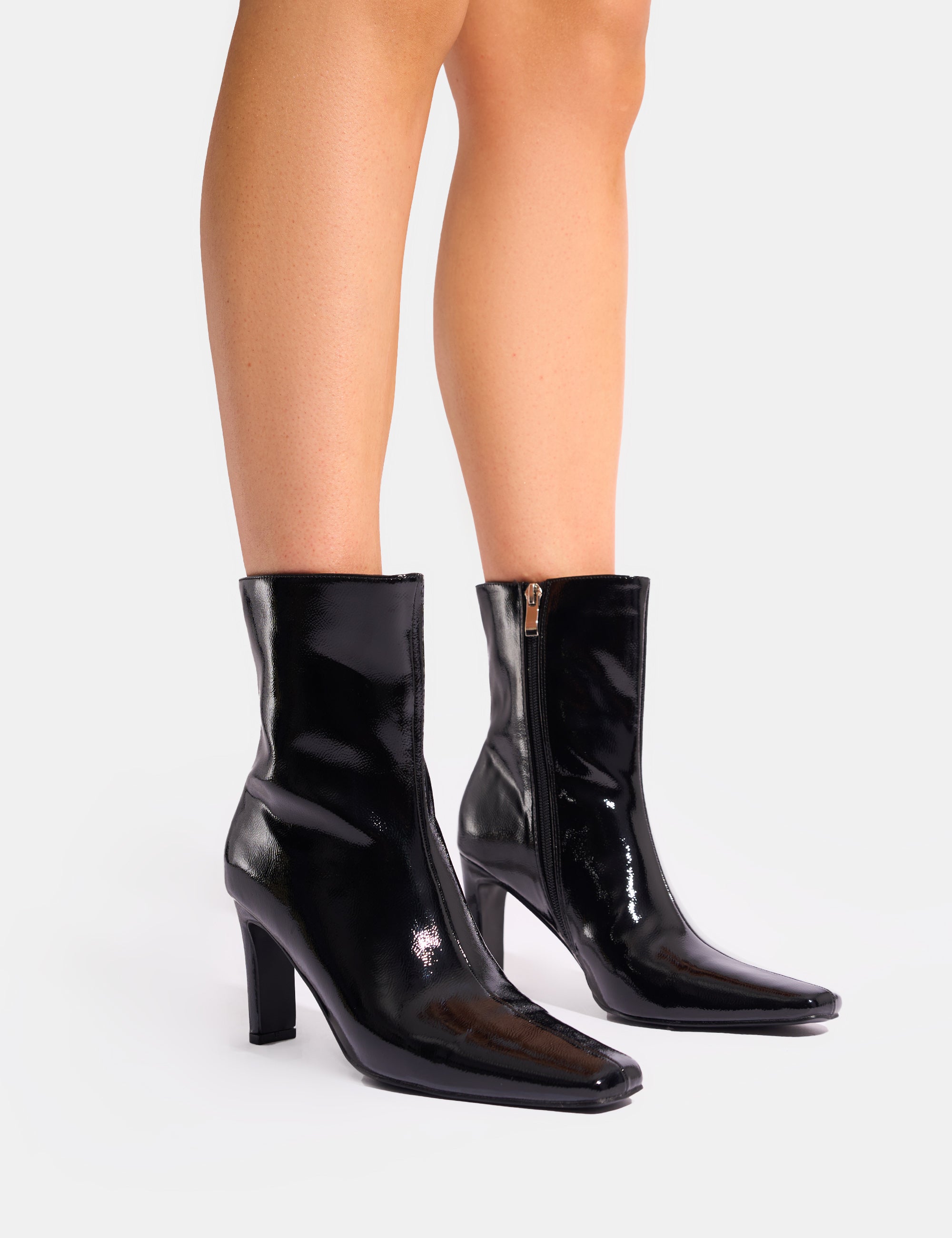These ankle boots are perfect for those who love to stand out. With a sleek patent black finish and a unique snipped toe design, you'll turn heads wherever you go. With a confident stride and a touch of sass, these boots will elevate any outfit.