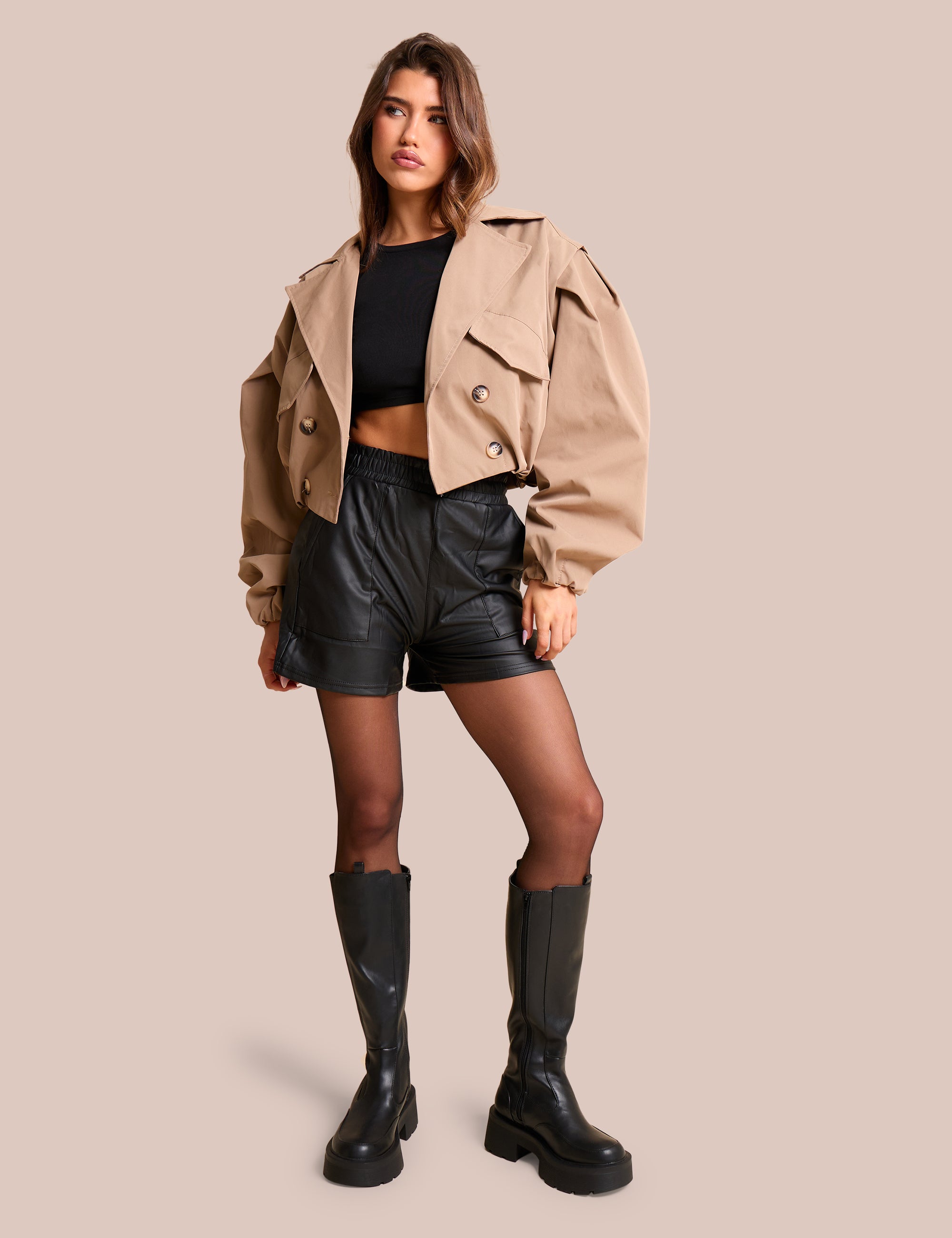 Make a bold statement with the High Waist Faux Leather Mini Shorts in Black. These sleek shorts hug your curves and accentuate your waist for a flattering silhouette, while the faux leather material adds an edgy, modern touch. Perfect for pairing with your favourite tops and jackets, they offer versatile style that transitions seamlessly from day to night.