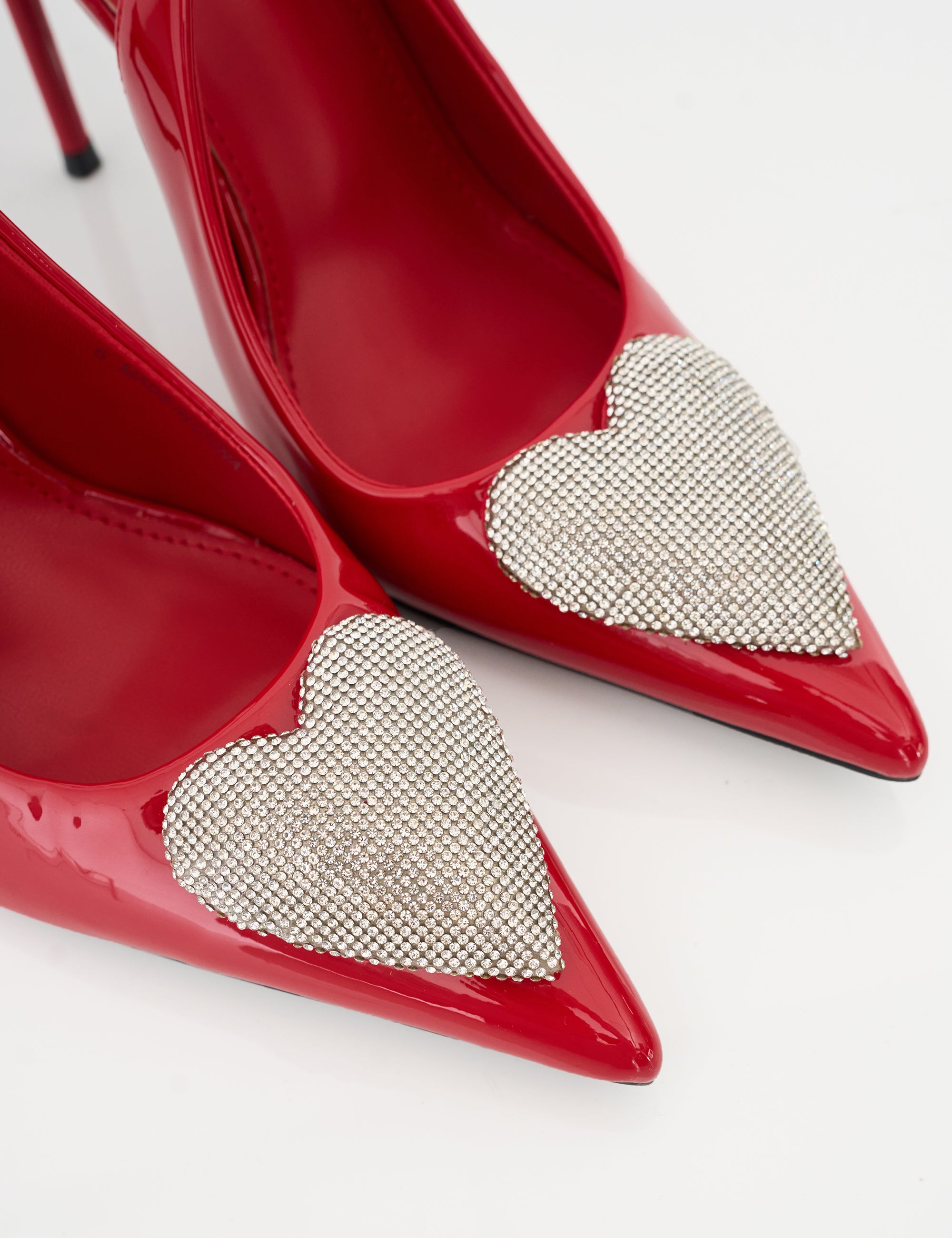 Elevate your style with these stunning court heels adorned with a red patent finish and a sparkling diamante heart brooch. Perfect for adding a touch of glam and romance to any outfit. The pointed toe and slingback design offer a flattering and chic look. Step out in confidence and make a statement!