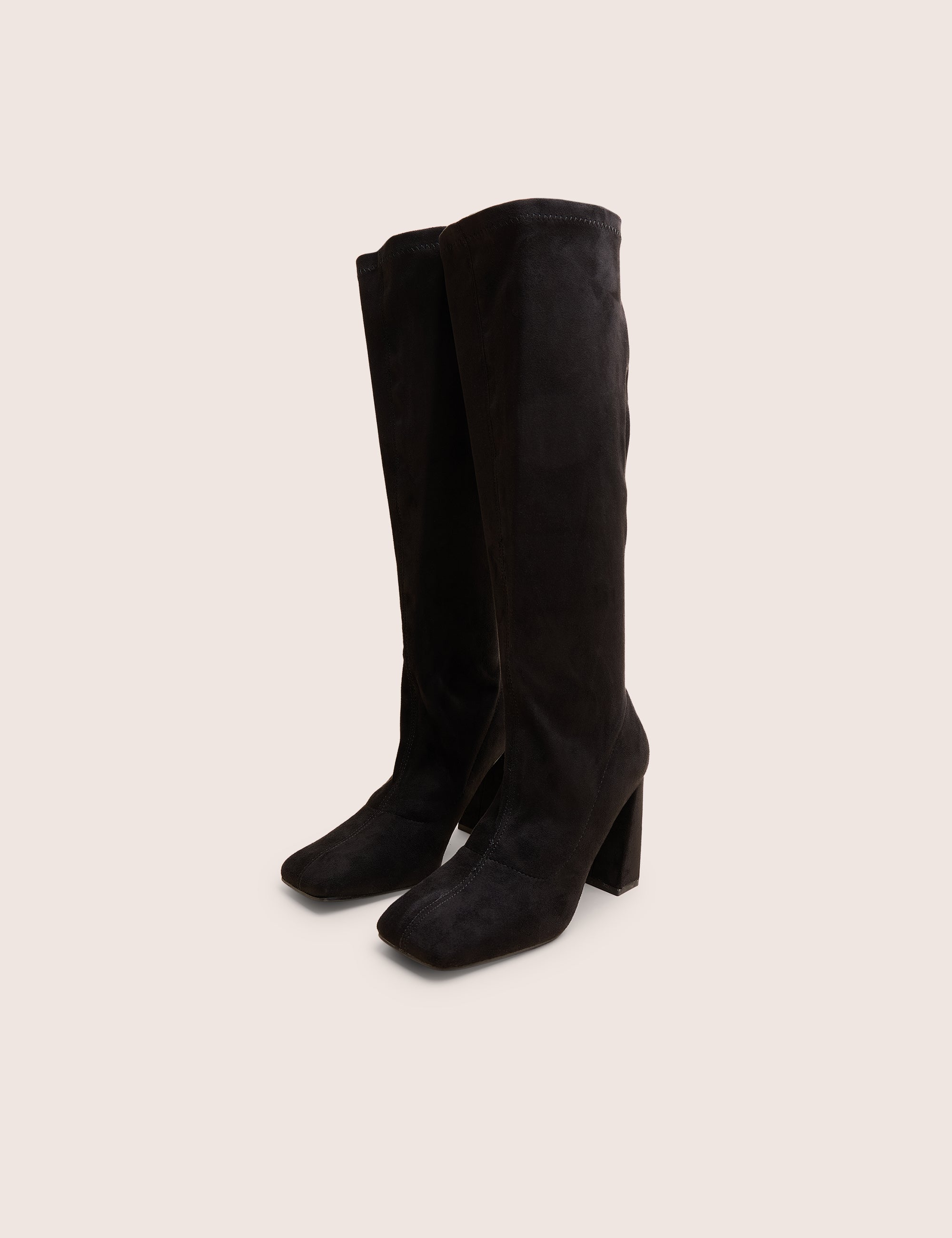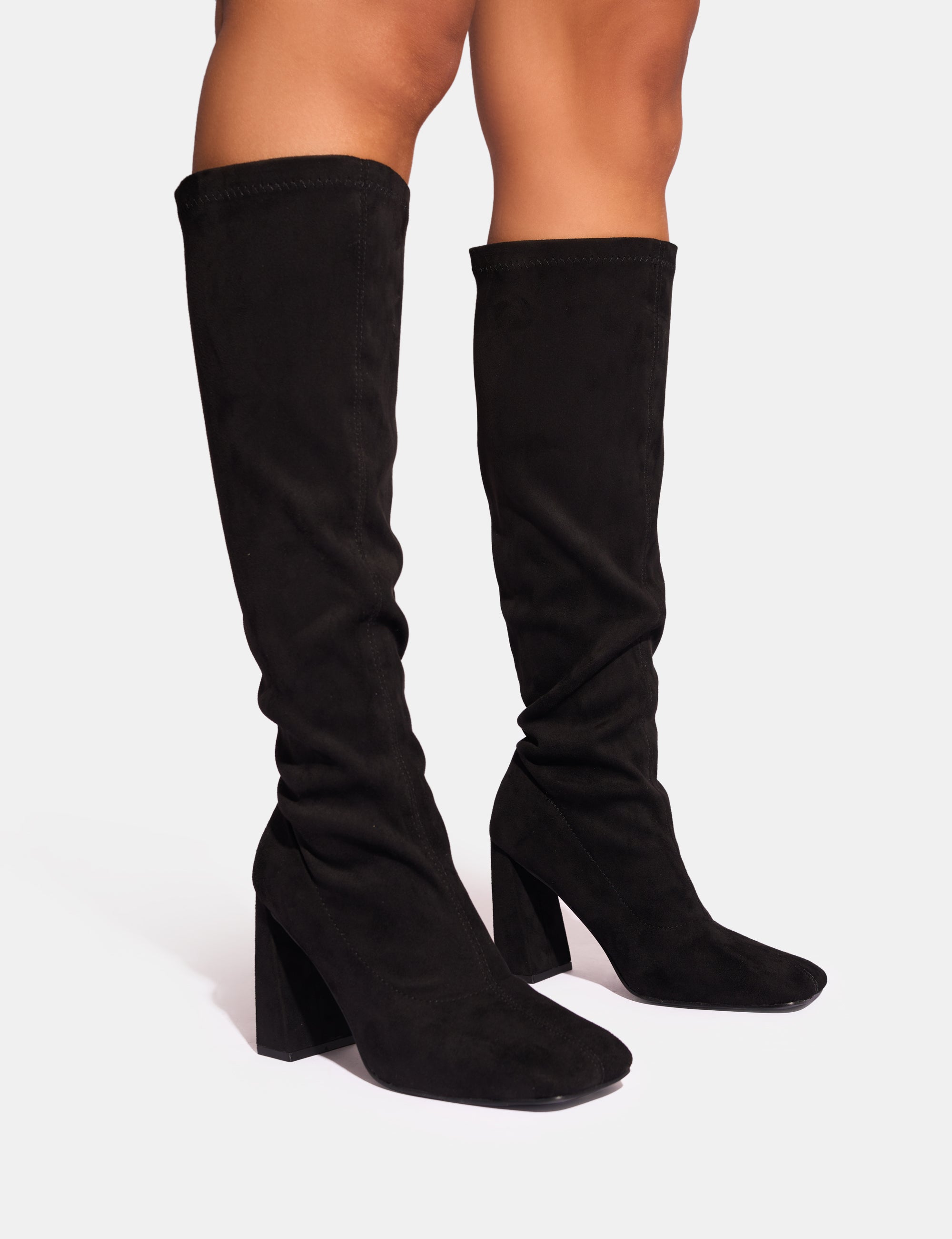- Audrina Black Suede Wide Fit Block Heel Knee High Sock Boots