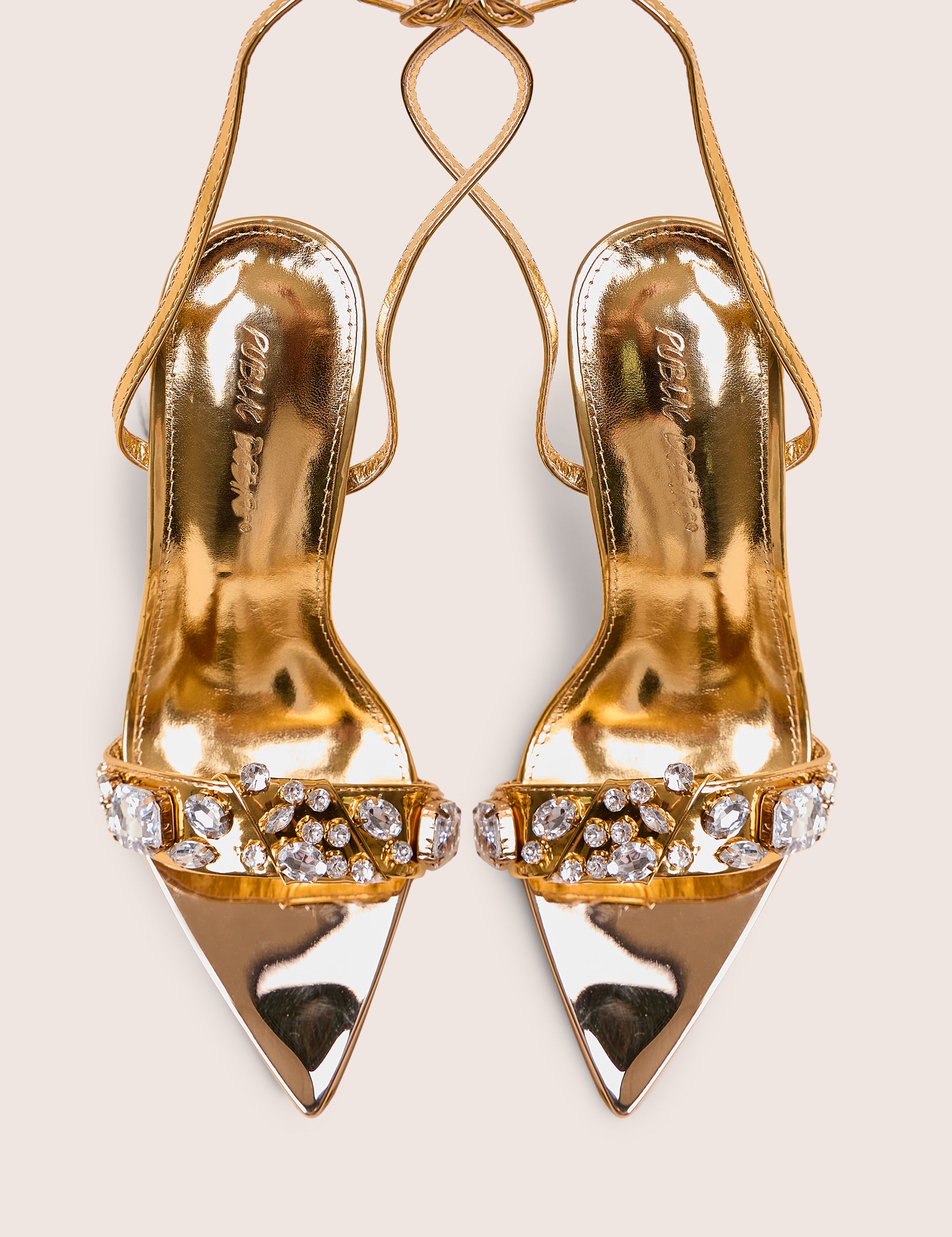 - Icicle Wide Fit Gold Metallic Patent Extreme Jeweled Ankle Strap Pointed Toe Stiletto Heels