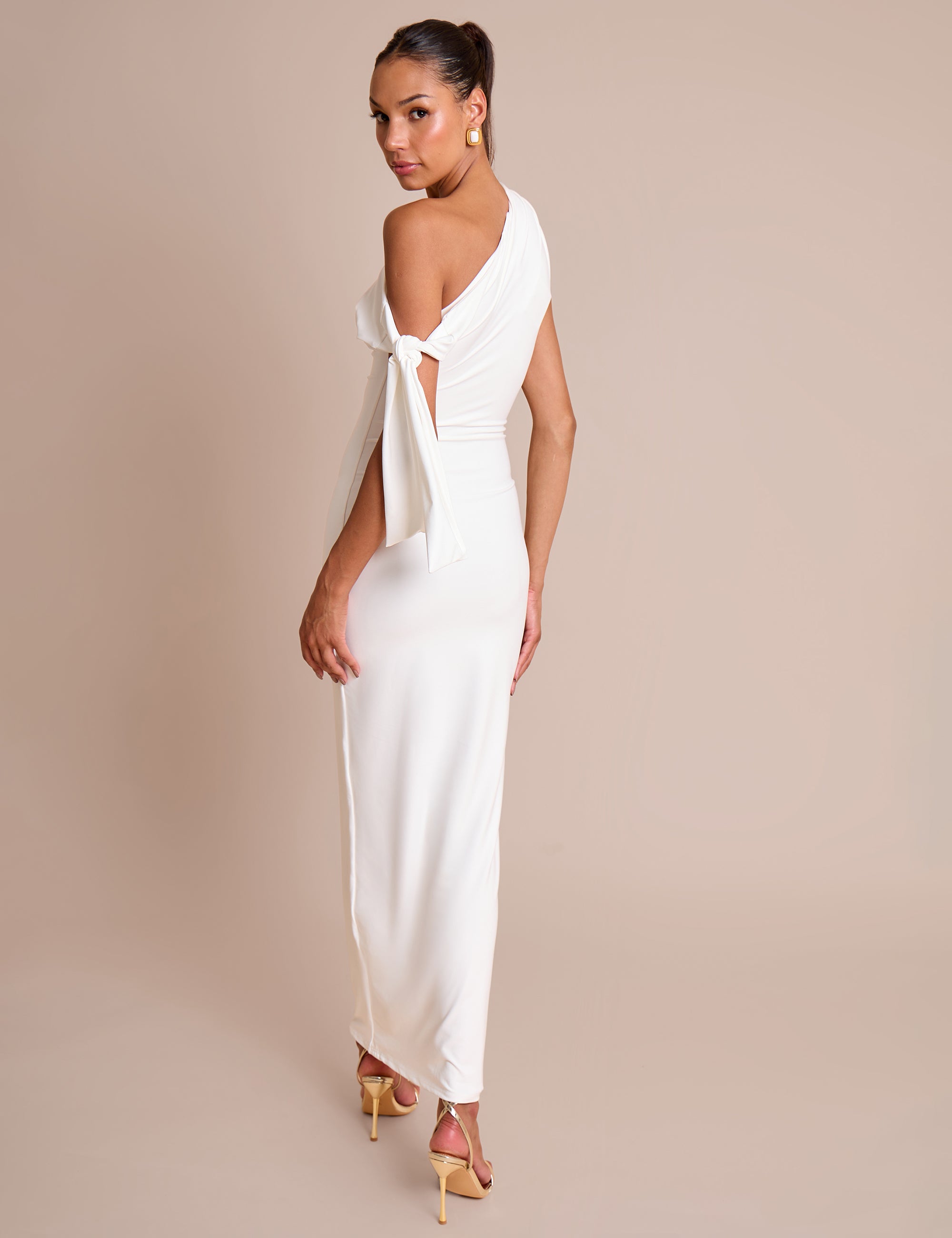 - Knot Detail Asymmetric One Shoulder Luxe Slinky Maxi Dress White
