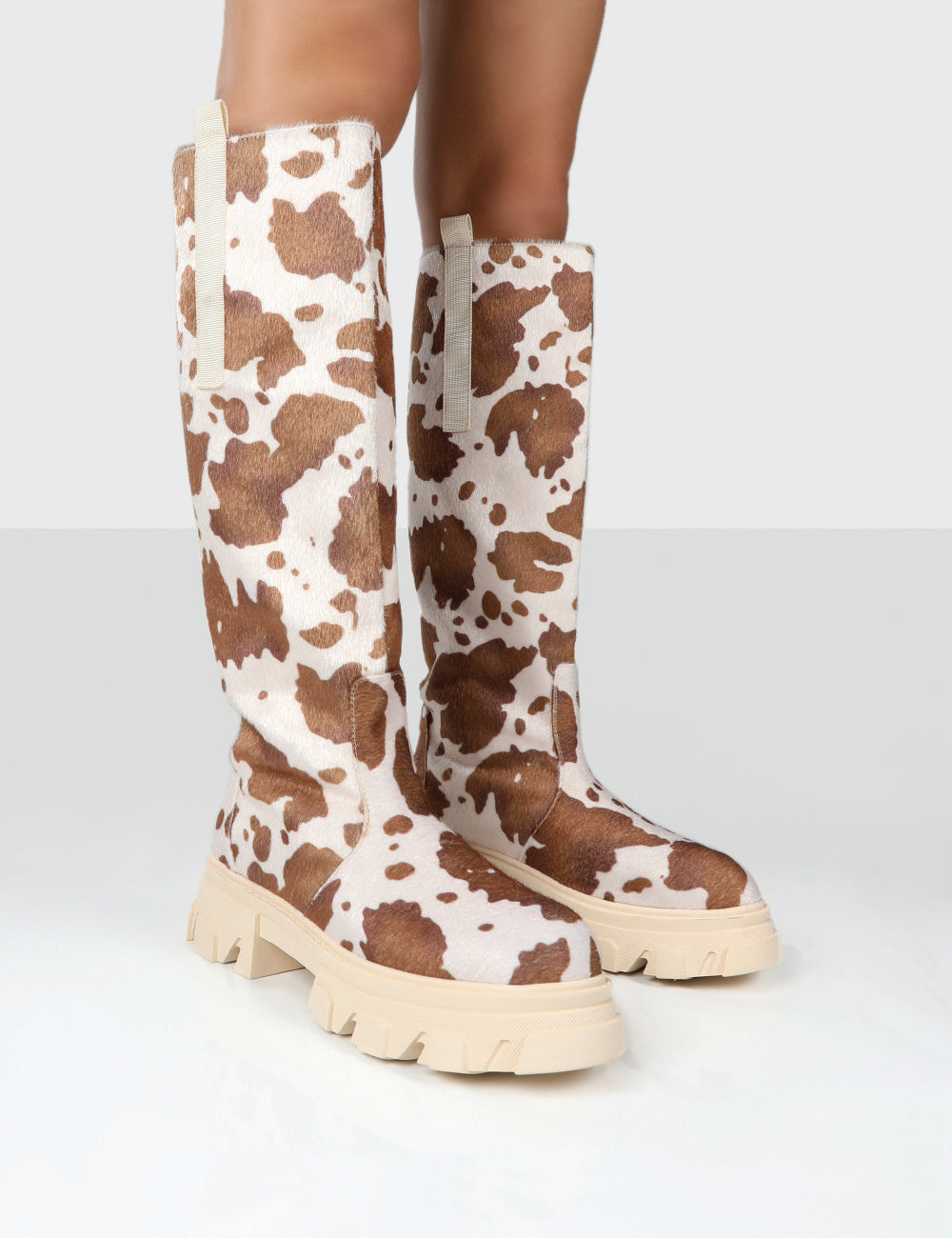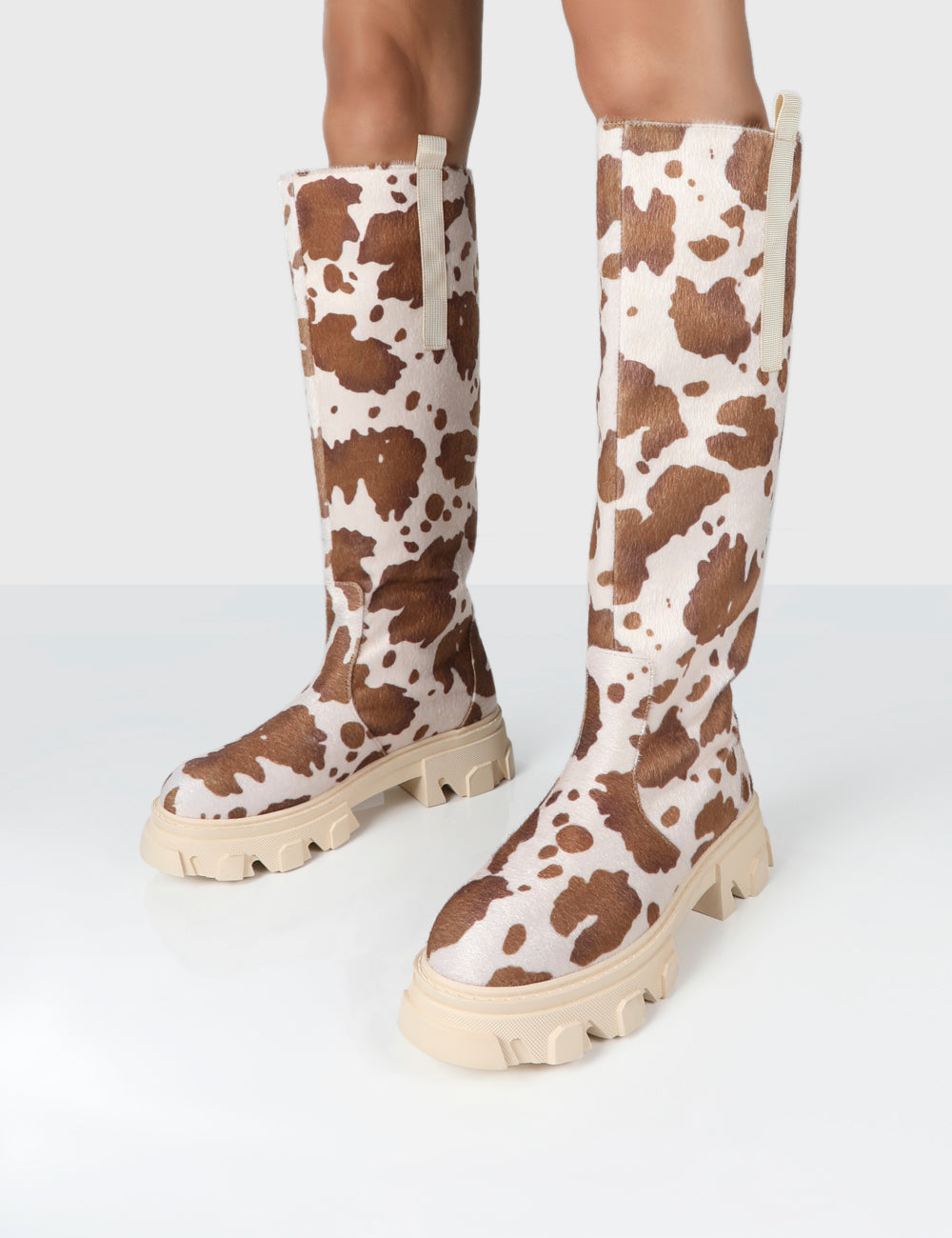 - Amber x Public Desire Genius Cow Print Knee High Chunky Sole Boot