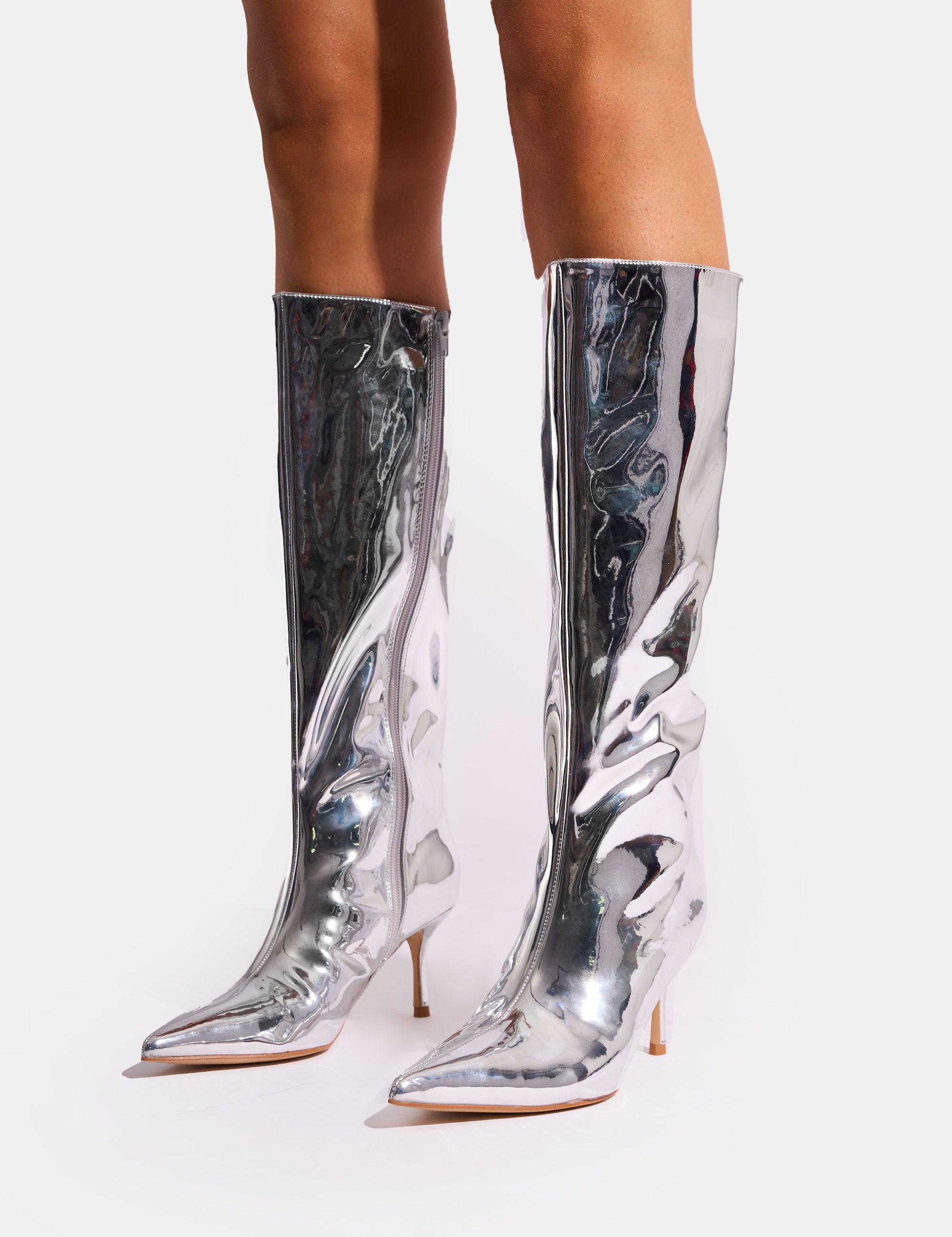 Amped Mirror Silver Pointed Toe Mid Heel Knee High Boots