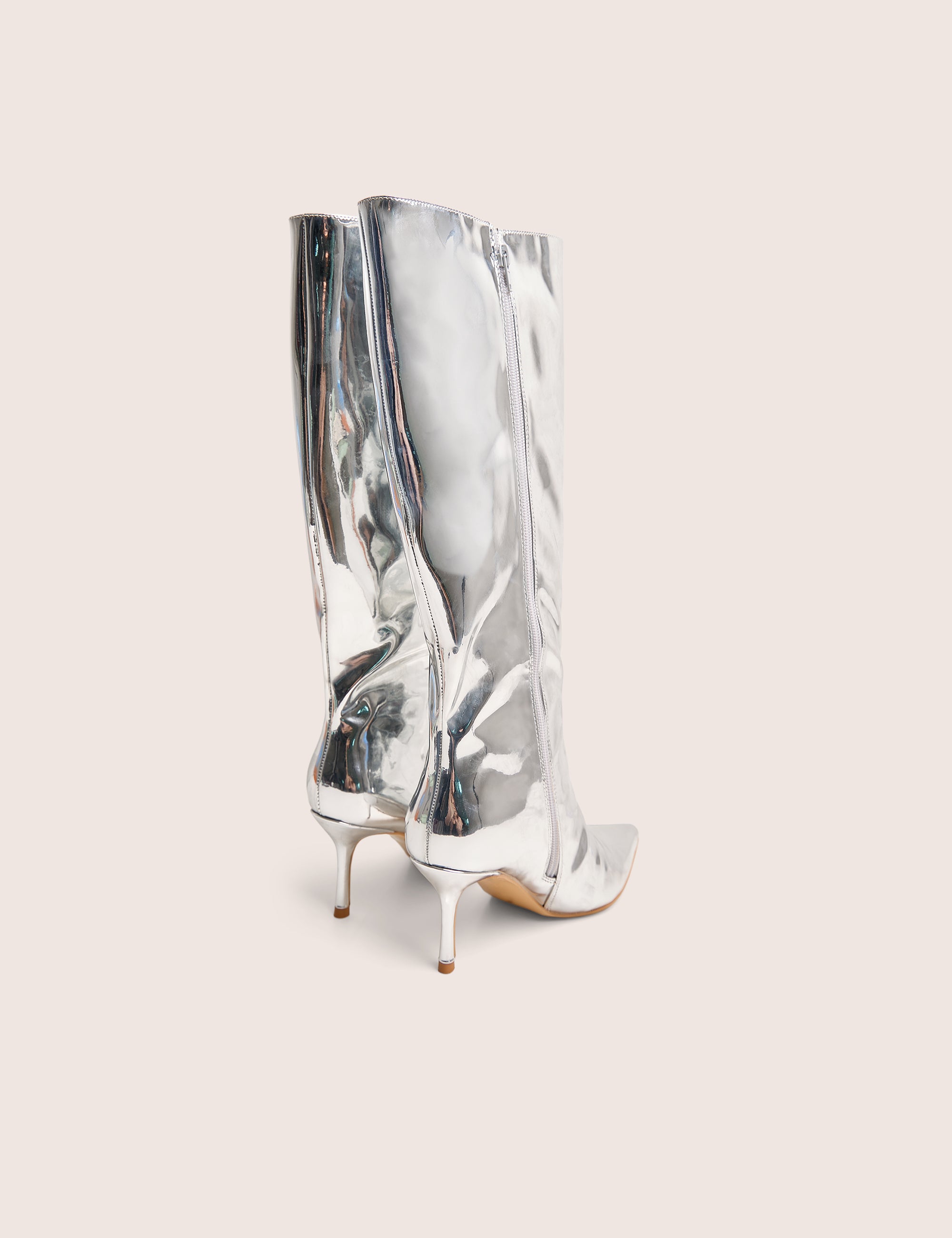- Amped Mirror Silver Pointed Toe Mid Heel Knee High Boots