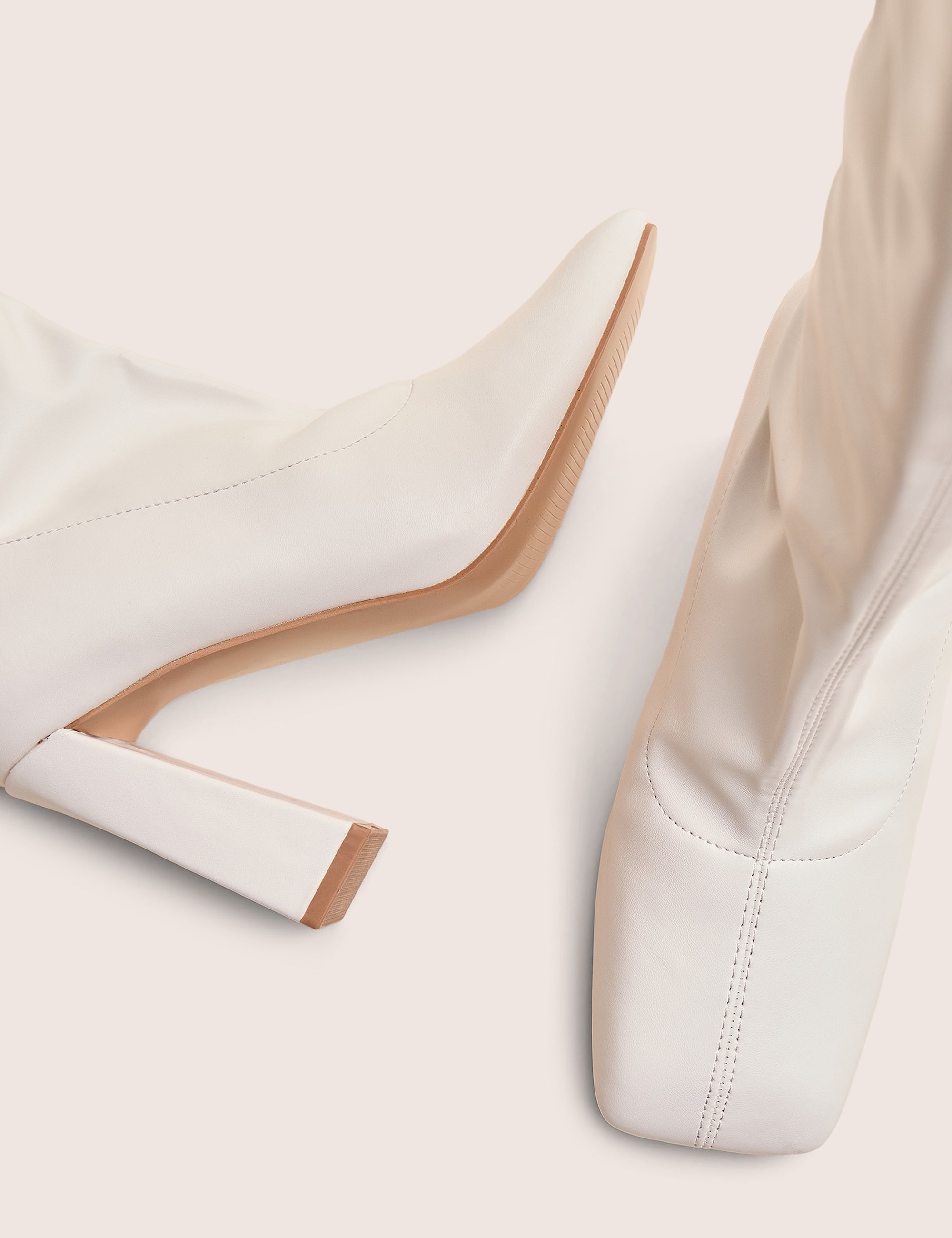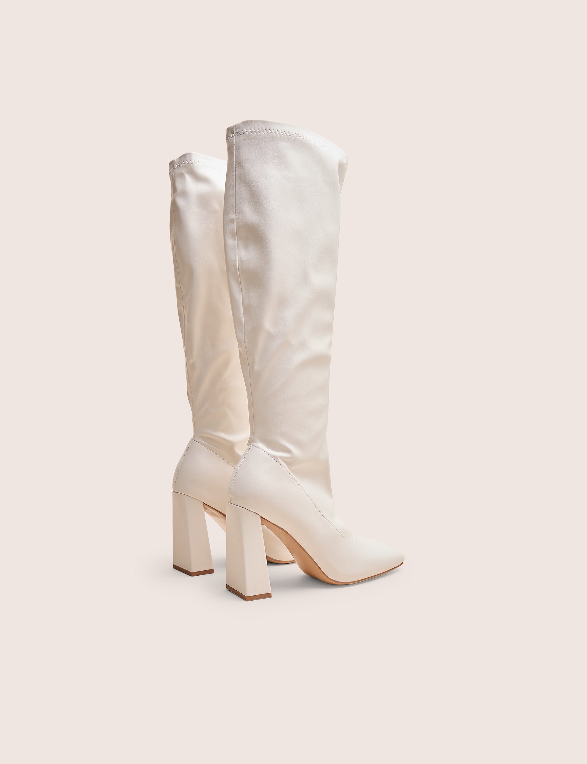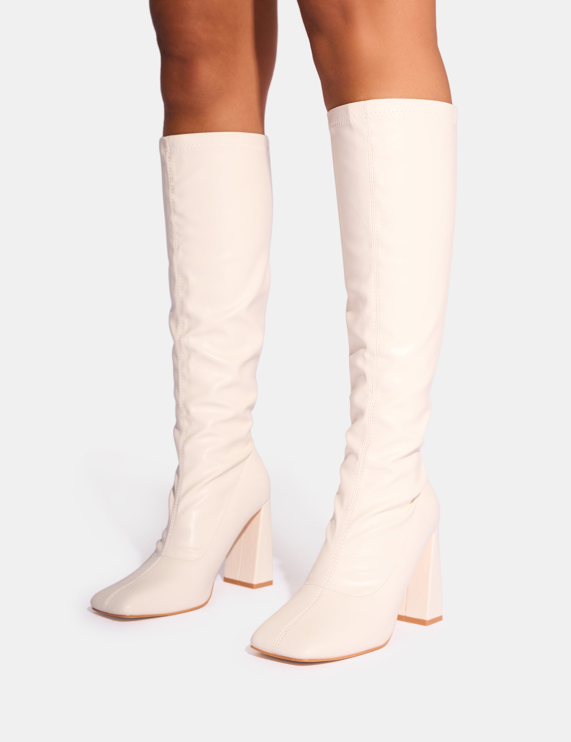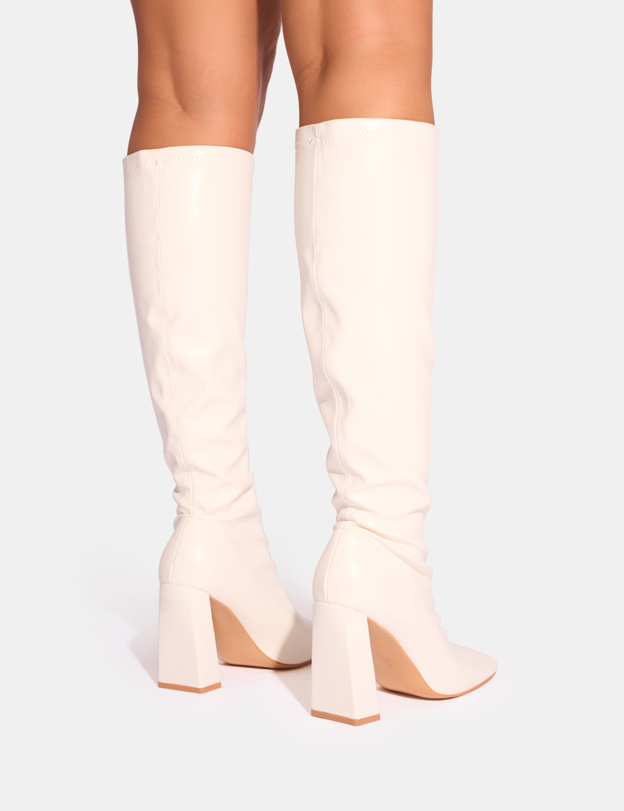 - Audrina White Pu Block Heel Knee High Sock Boots
