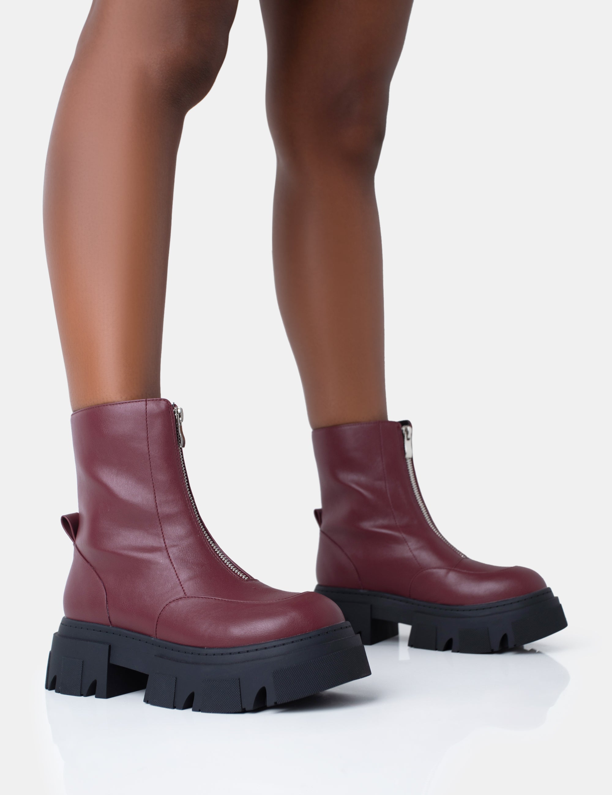 Bergen Burgundy Pu Zip Up Detailed Rounded Chunky Soled Ankle Boots