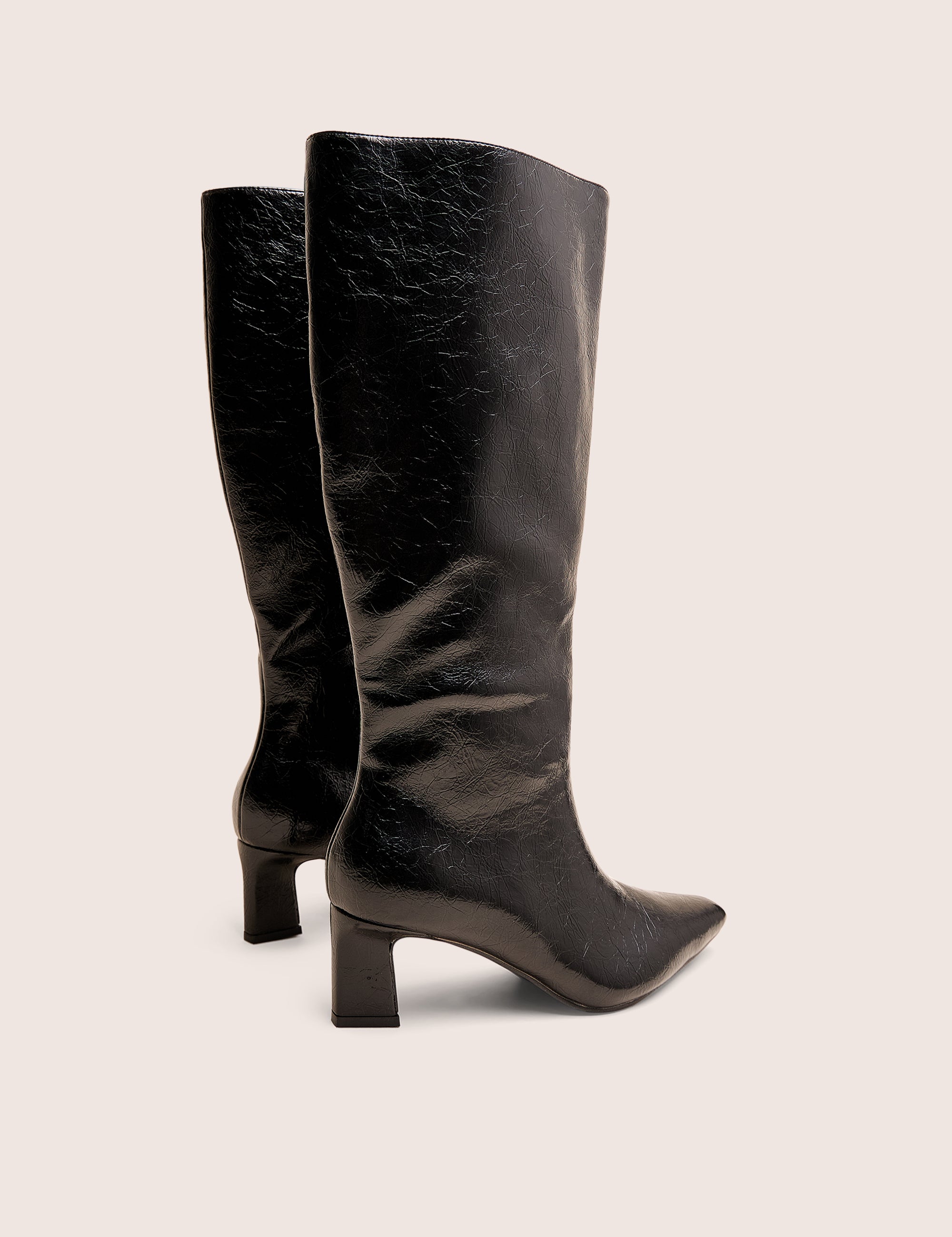 - Boomer Black Crinkle Pu Pointed Toe Knee High Mid Heel Boots