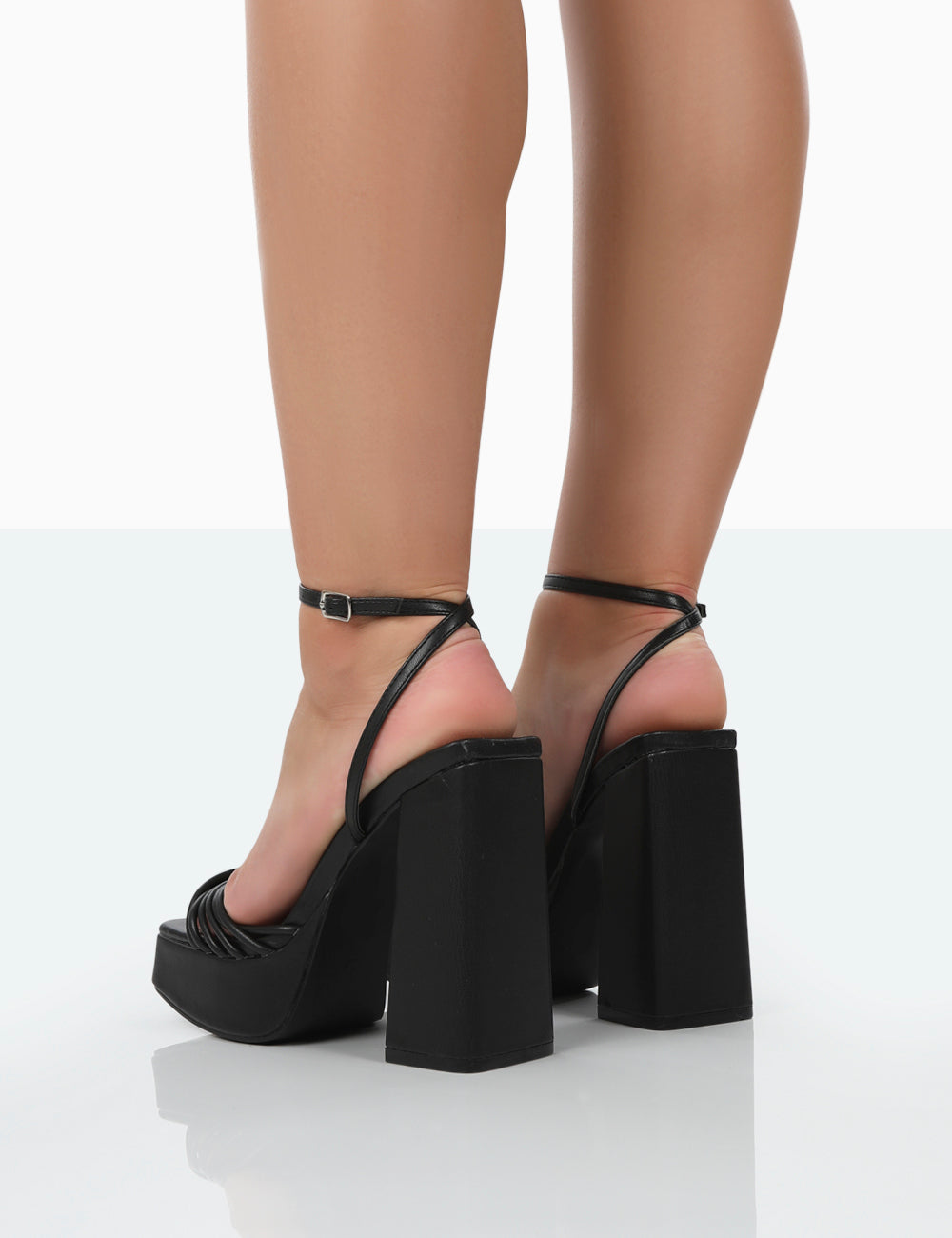 - Boujee Black Pu Square Toe Strappy Block Heels