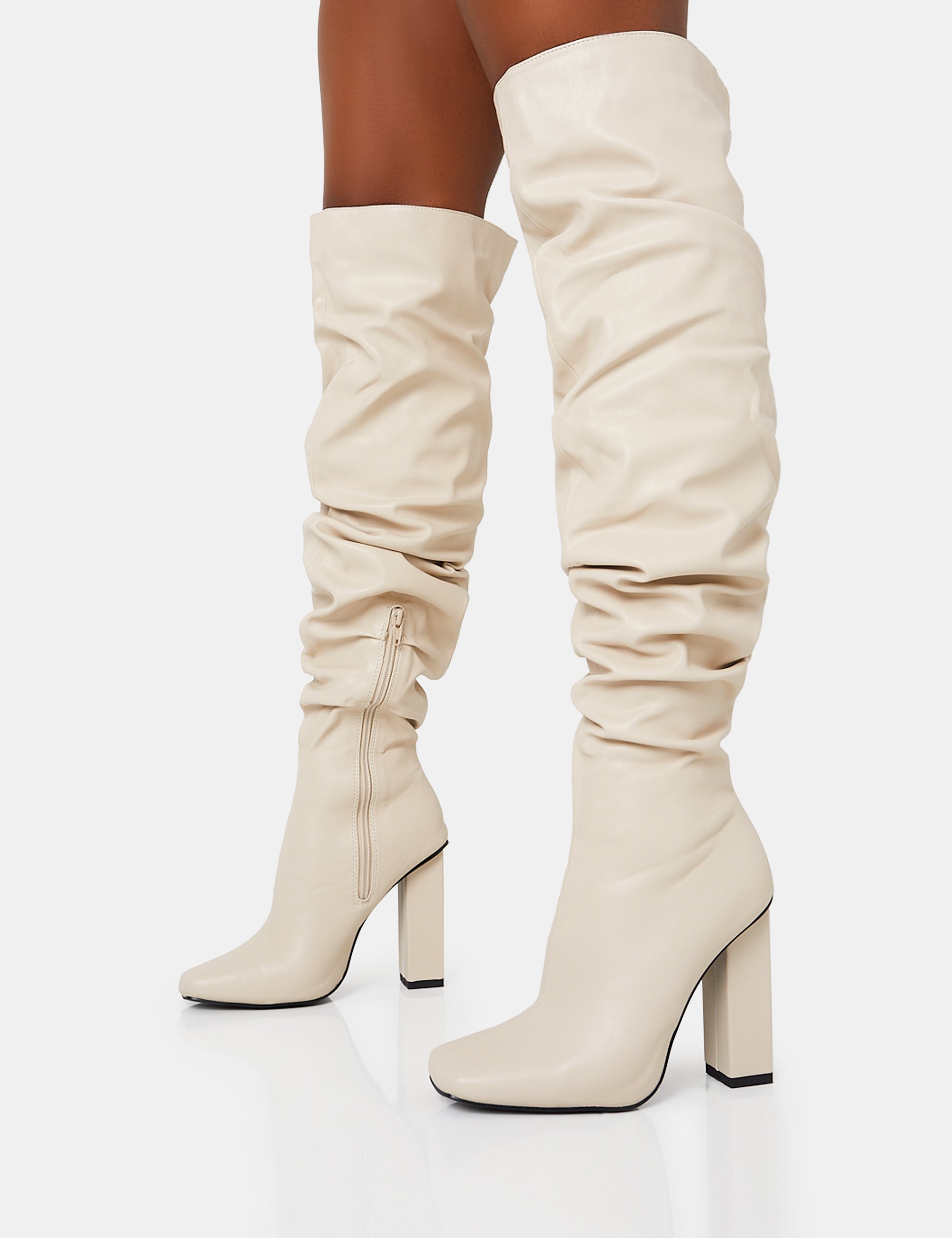 - Cassia Ecru Square Toe Block Heel Over The Knee Boots