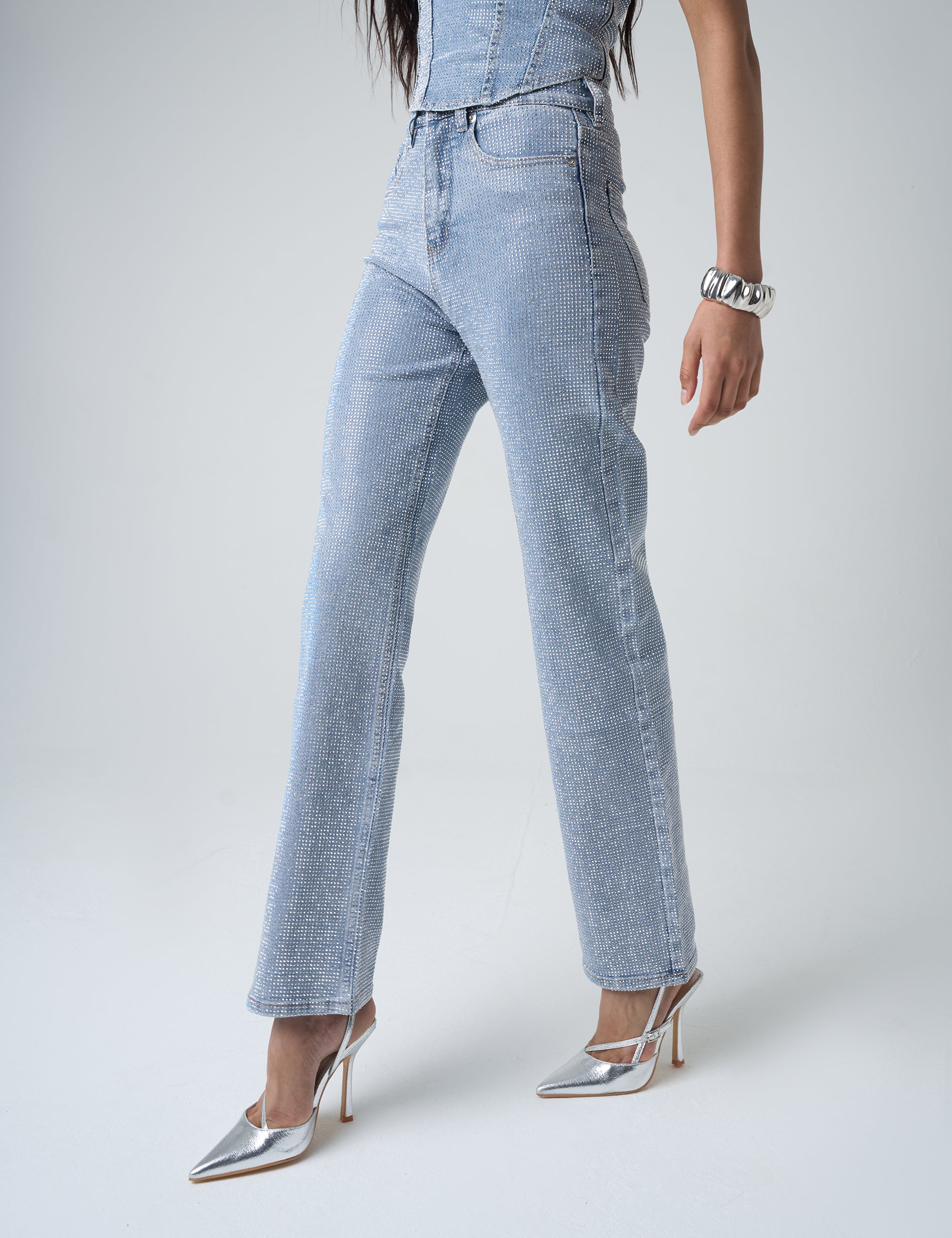 - Diamante Straight Fit High Rise Denim Jeans Blue