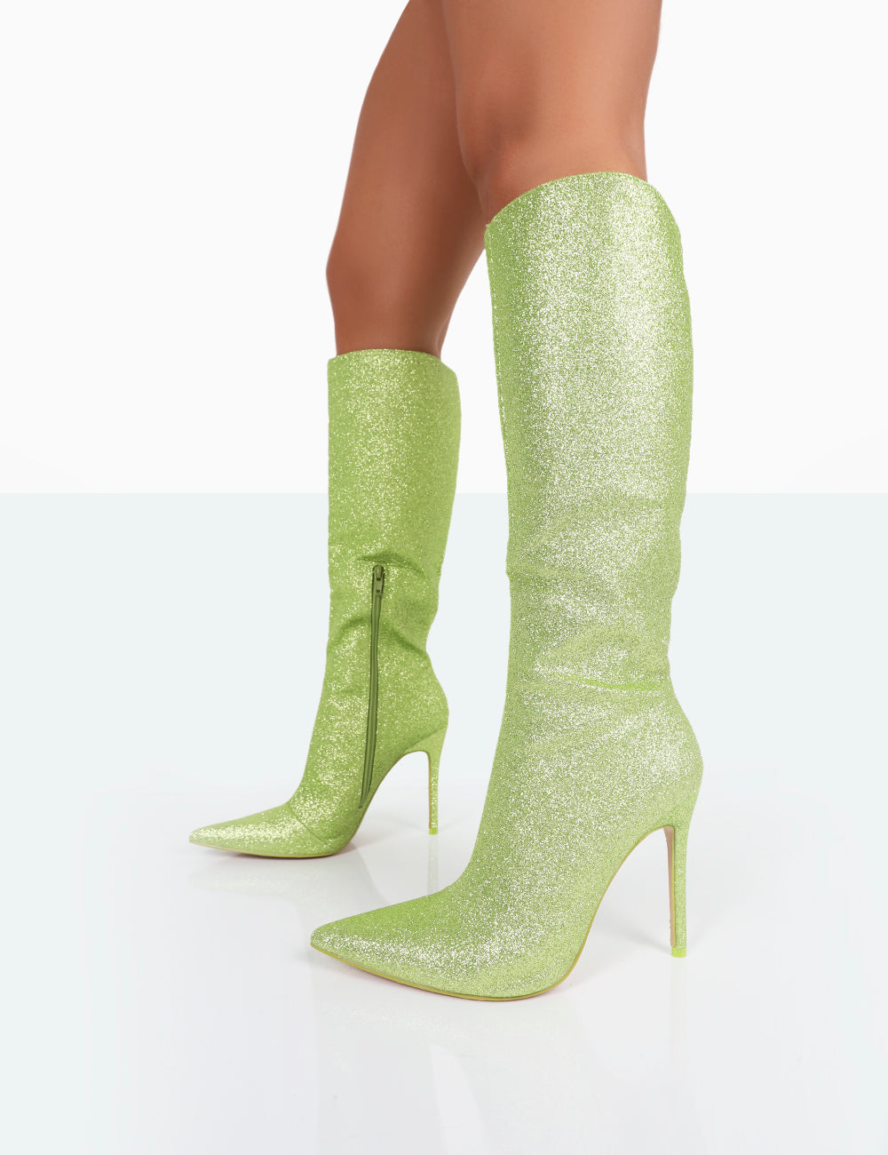 - Diva Lime Glitter Pointed Toe Stiletto Knee High Boots