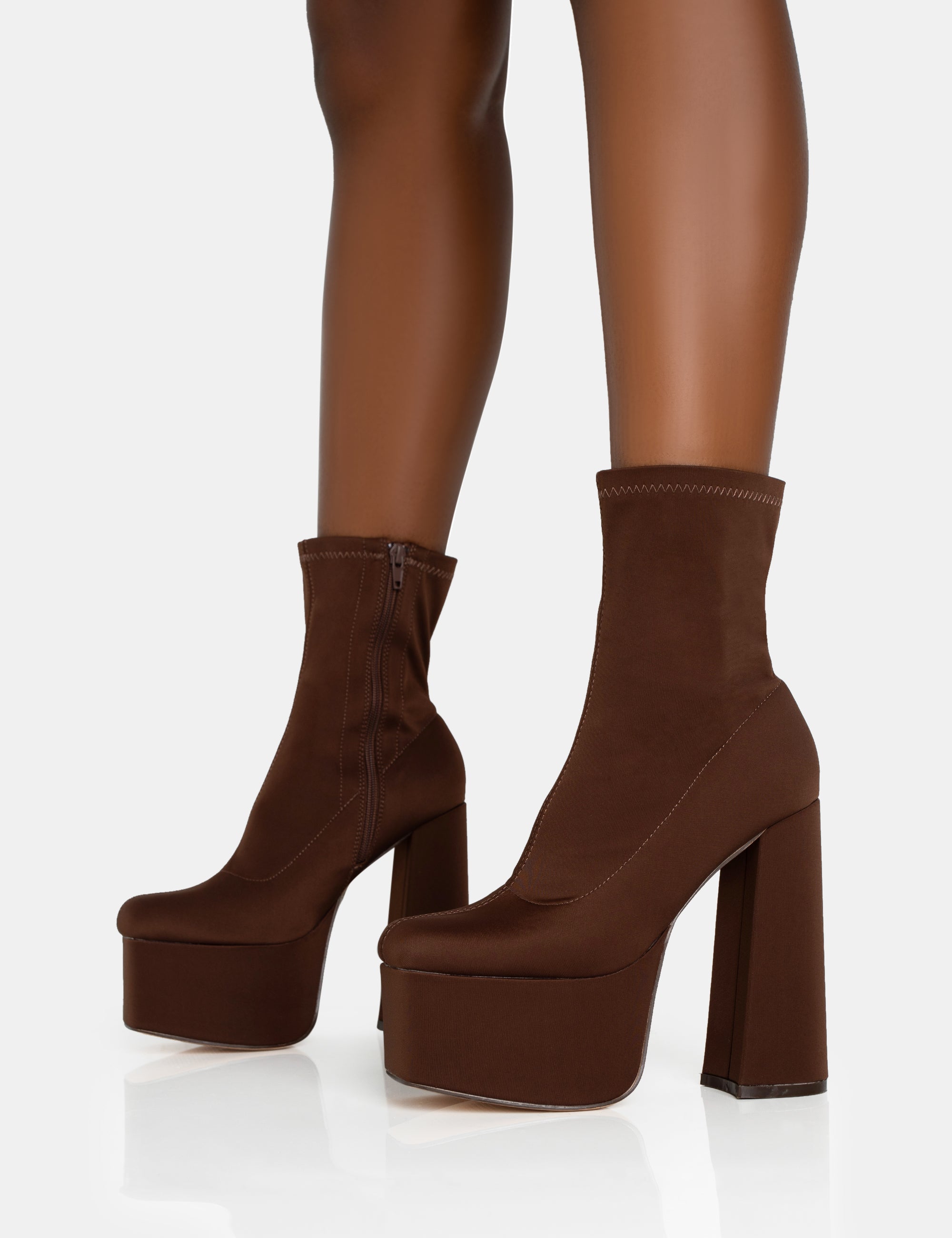 - Dominate Chocolate Nylon Platform Rounded Block Heeled Ankle Boots