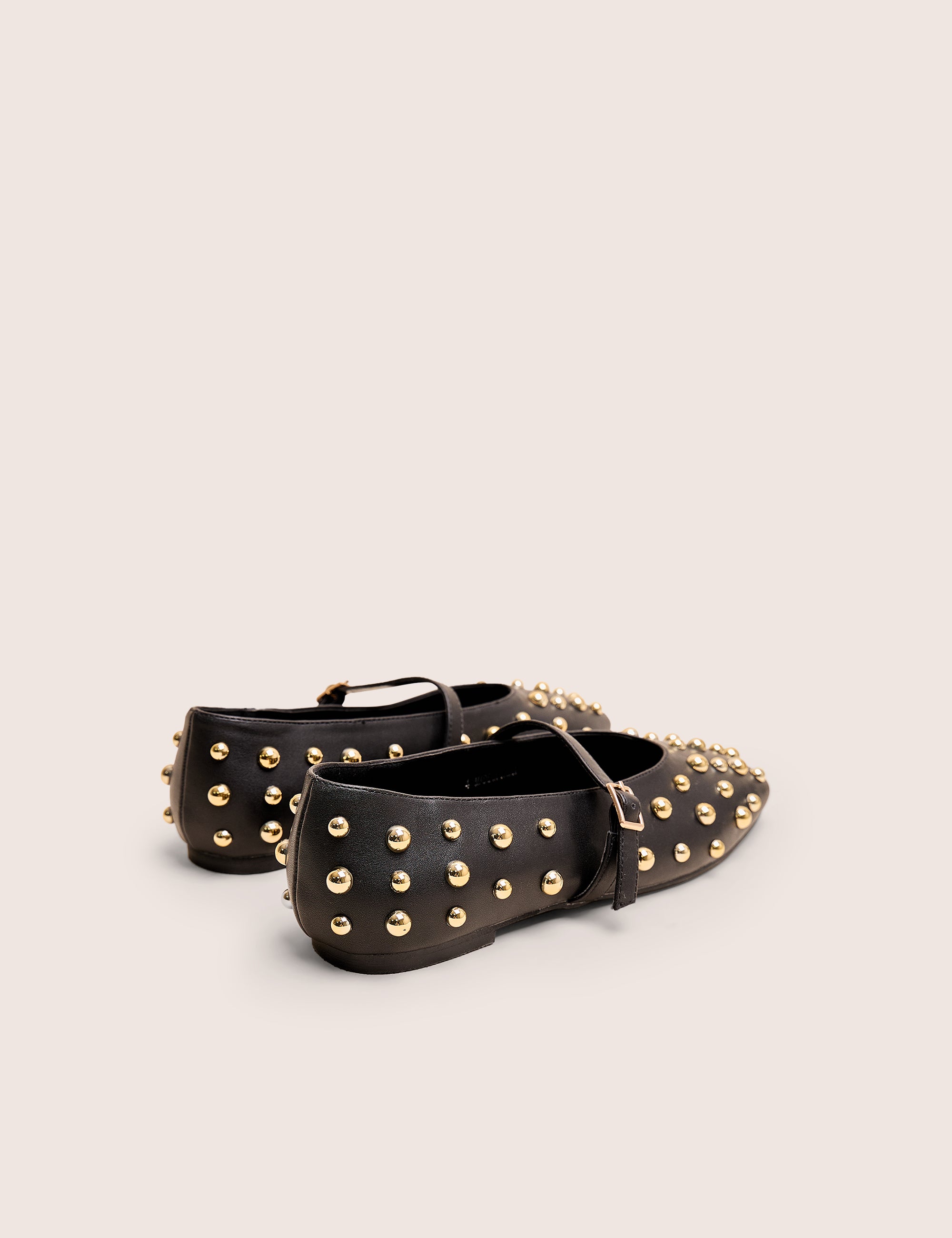 Elevate your everyday style with the Elsie Black Studded Ballerina Flats. The edgy studded detailing offers a perfect balance of sophistication and attitude. Designed for comfort and versatility, these flats effortlessly complement both casual and dressy looks. Step out with confidence and add a bold touch to your wardrobe essentials.