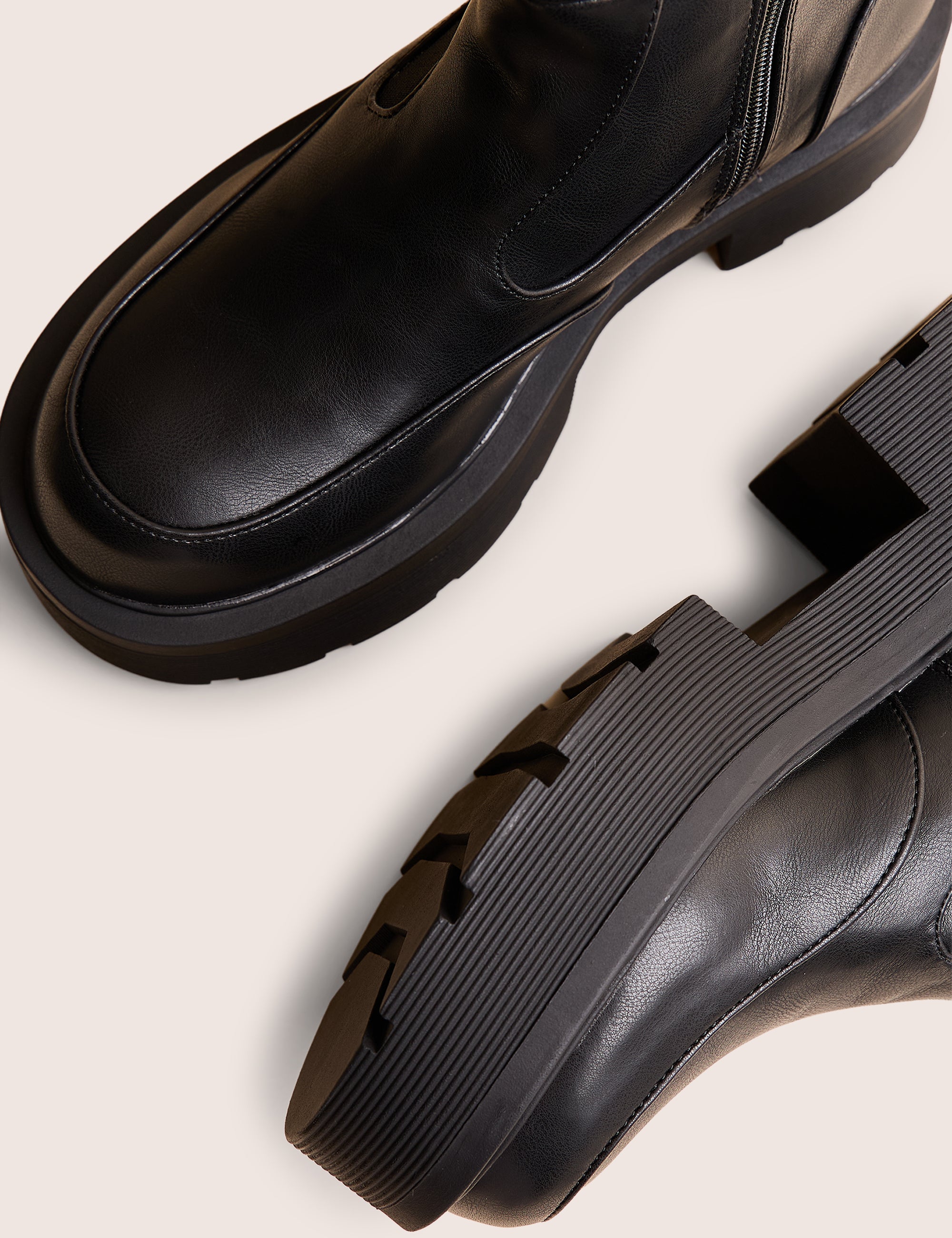 - Evergreen Black Pu Wide Fit Knee High Elasticated Detail Chunky Heeled Sole Boots