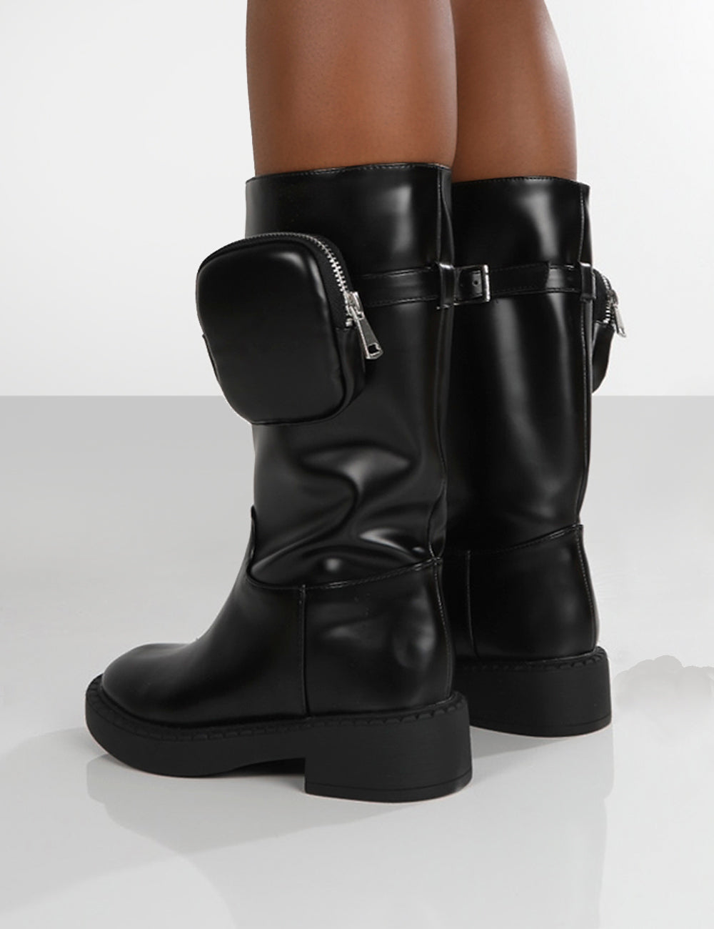 - Evoke Black Pocket Detail Chunky Sole Calf Height Boot