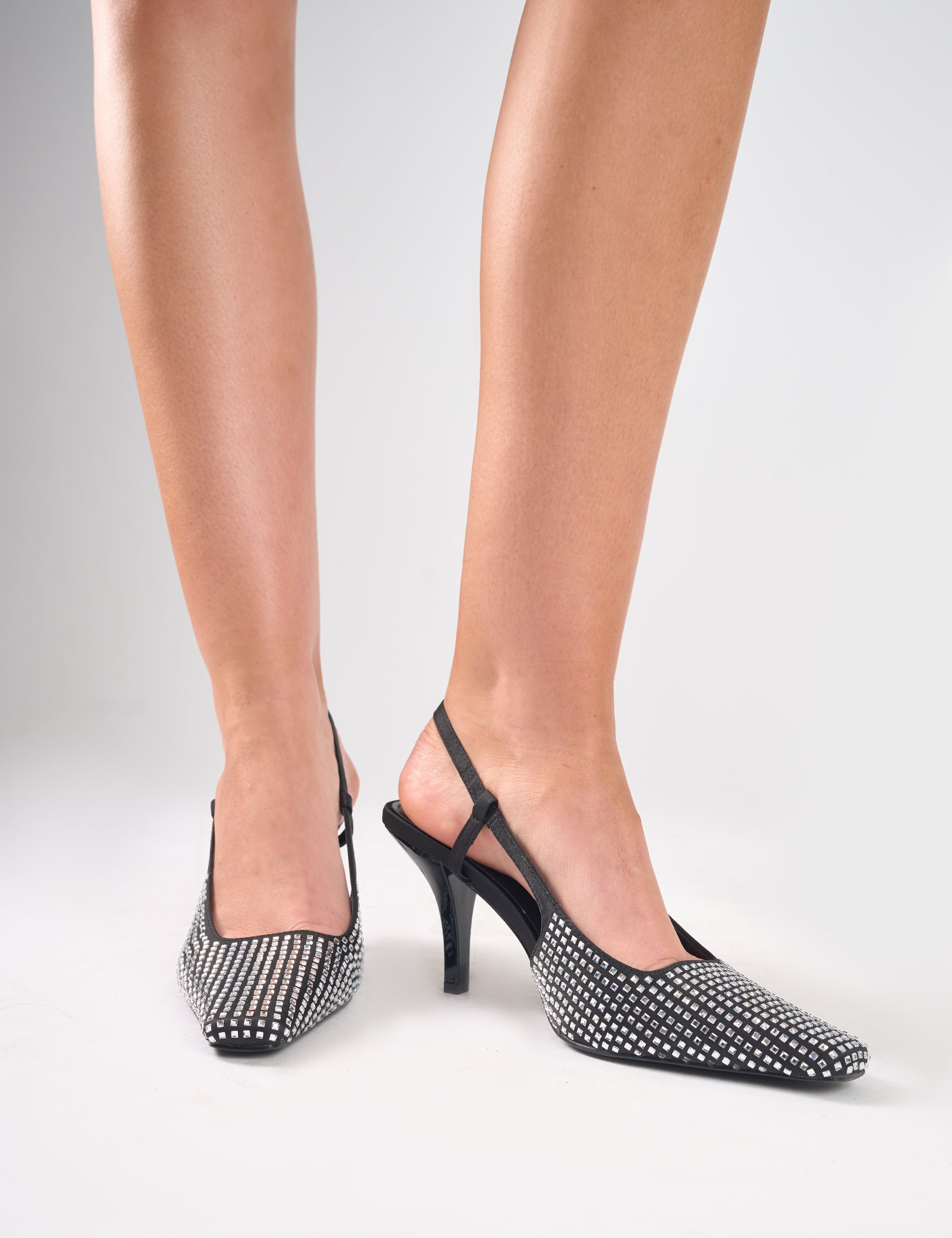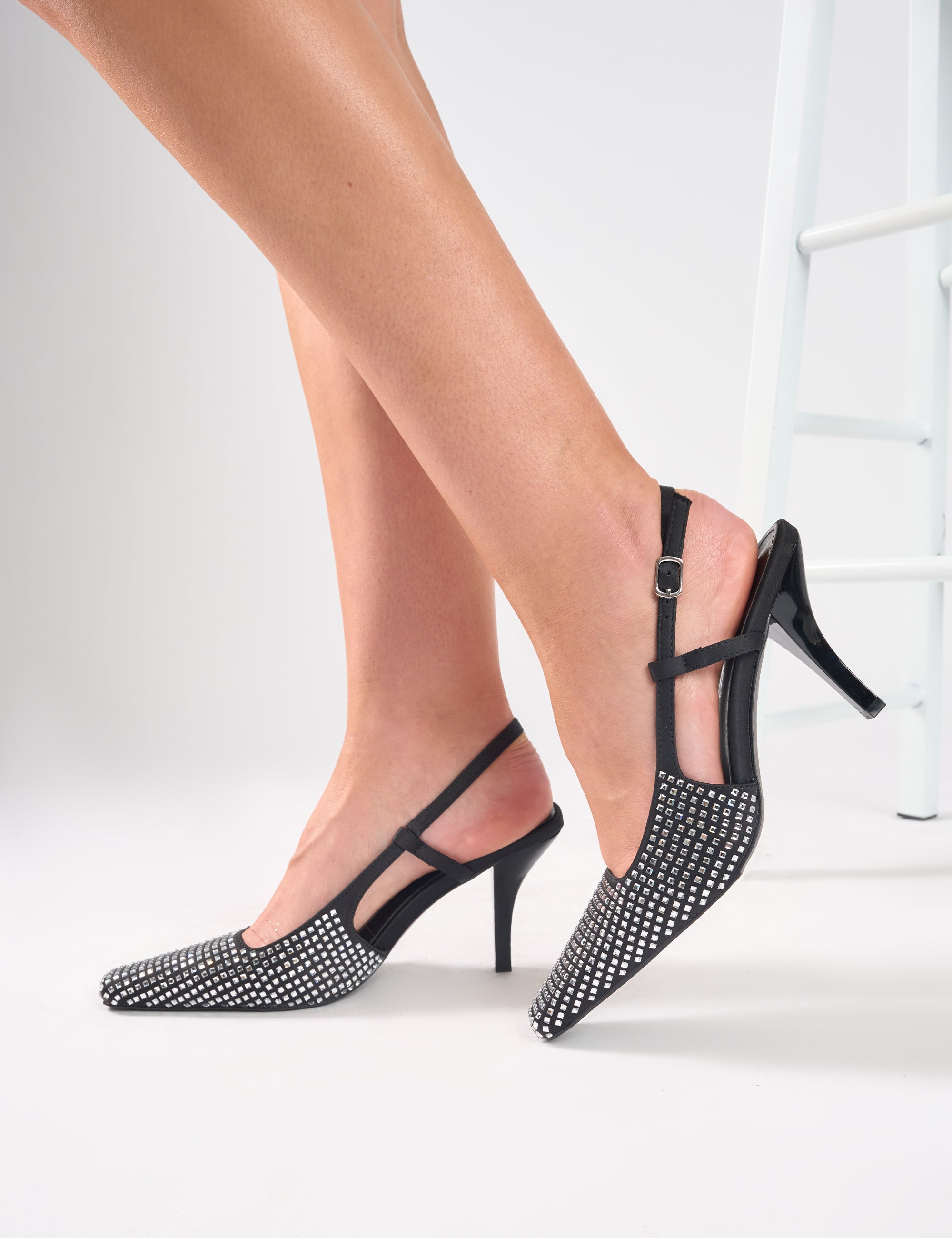 Elevate your style with Gloria Black Embellished Sling Back Court Heels. These stunning heels not only add a touch of sparkle to any outfit with their embellished design, they also provide comfort and support with their sling back construction. Perfect for any occasion that calls for a touch of elegance.