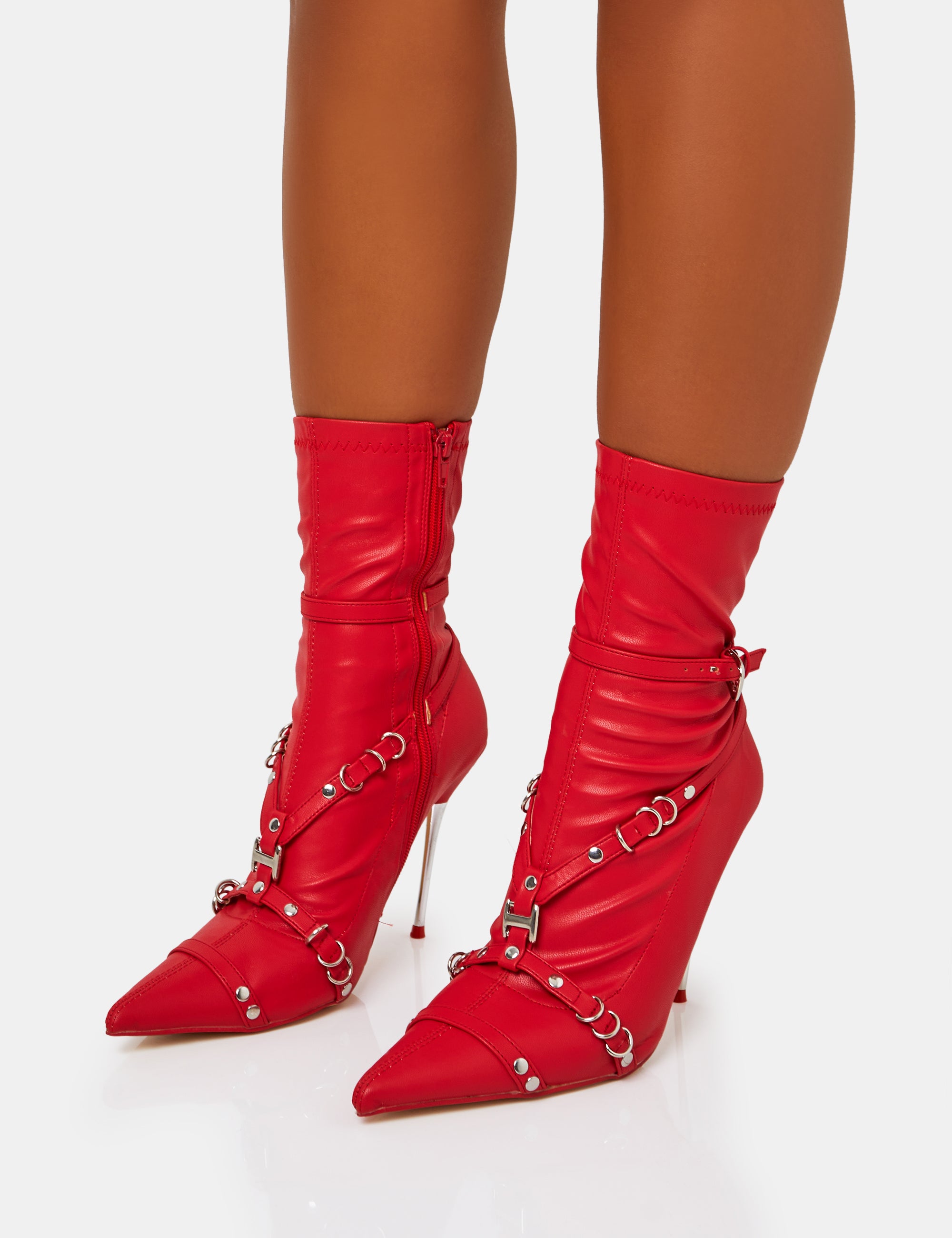 - Joyride Red Pu Strappy Buckle Harness Detail Pointed Toe Stilleto Sock Ankle Boots