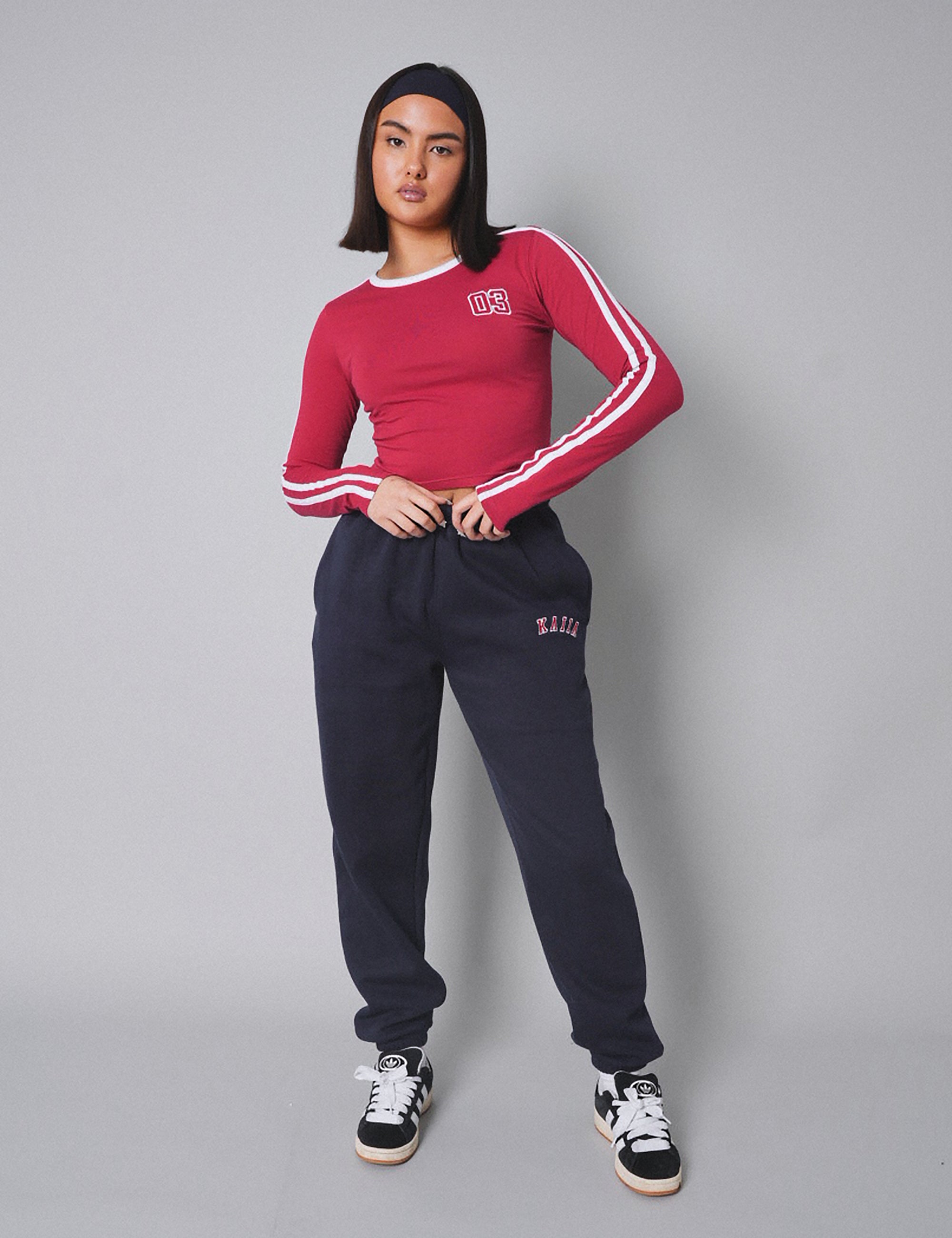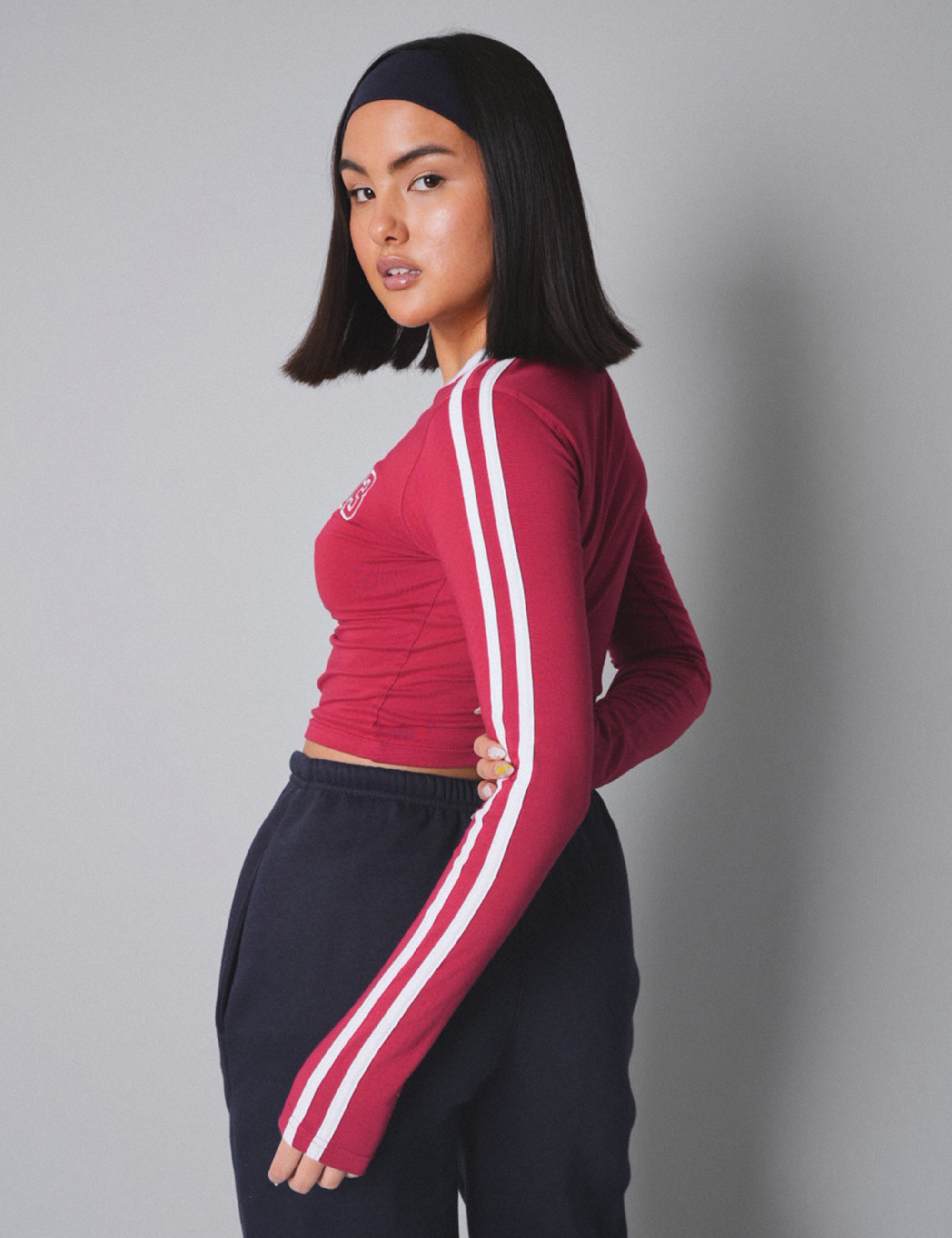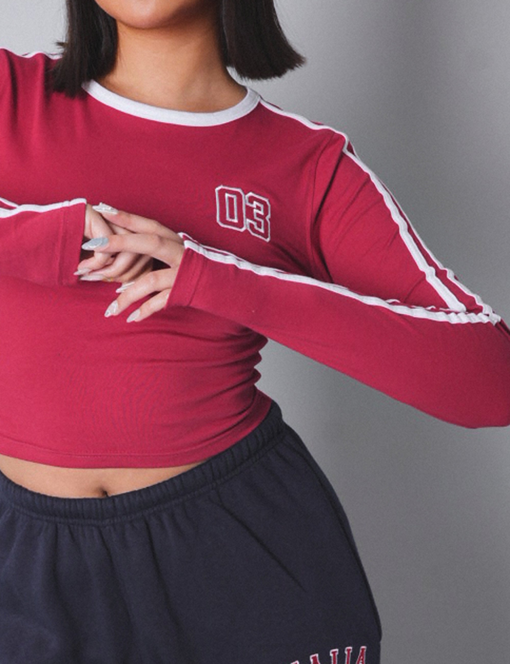 Greet the blokecore era in style with this Kaiia Sporty Long Sleeve Tee with Contrast Binding in Red & White. Perfect for mixing up your look in a fun, sporty way. Take your style to the next level with this must-have piece!