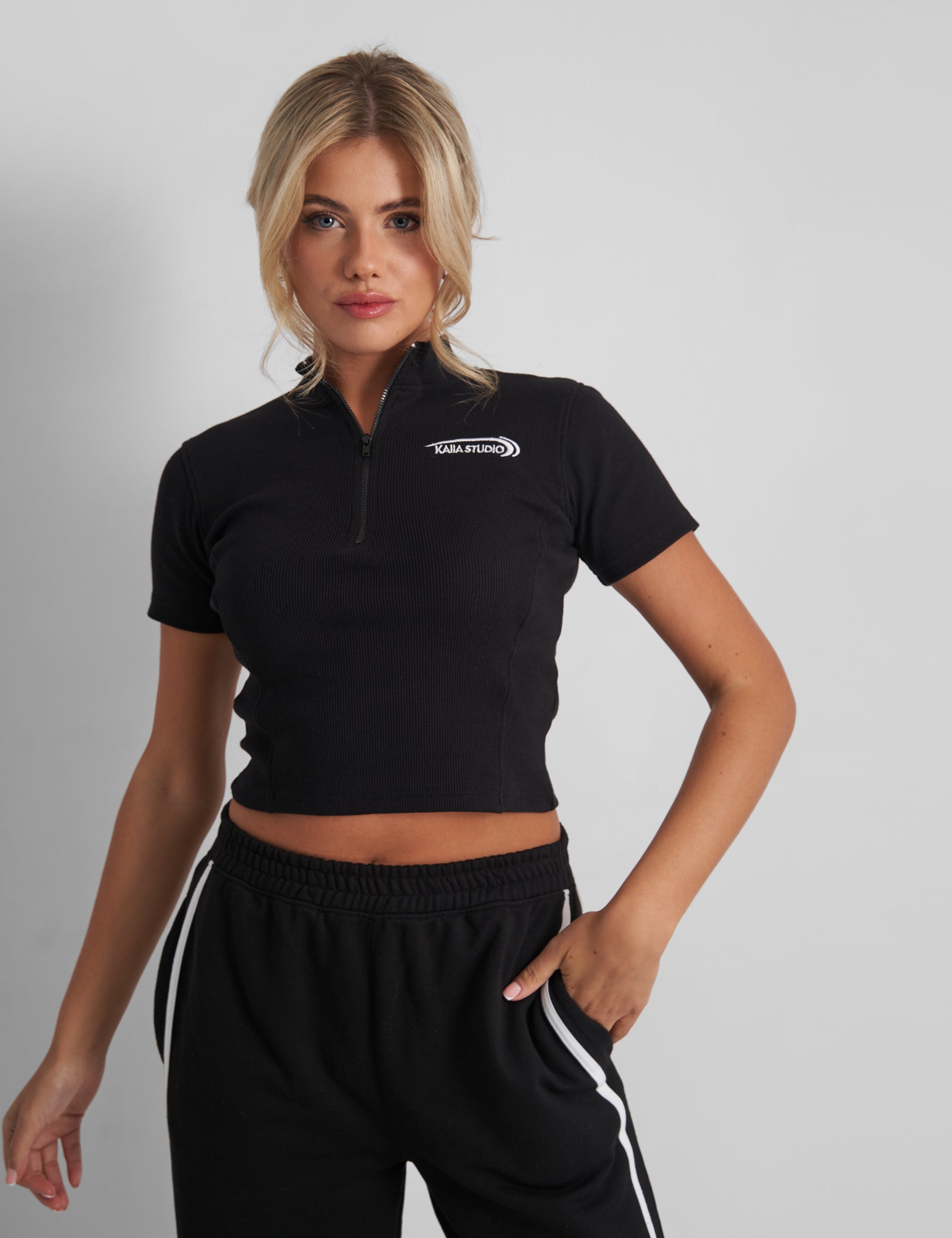Unleash your inner Sporty Spice babe with our Kaiia Studio Zip Up Logo Crop Top in classic black! Featuring short sleeves and a convenient zip up closure, this crop top is perfect for any active outfit. Stay stylish and comfortable while looking effortlessly cool.