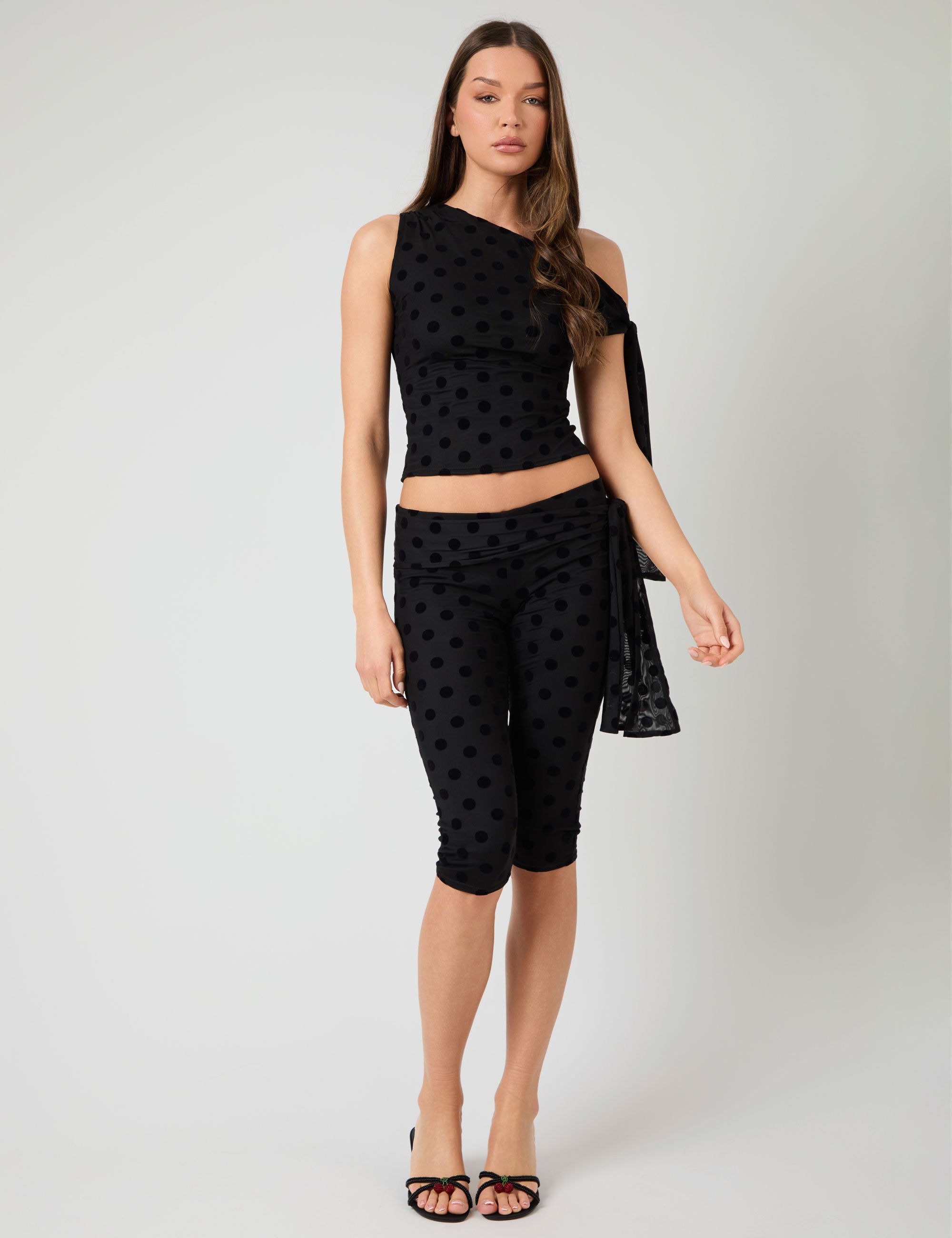 Knot Detail Tie Side Polka Dot Devore Capri Pants Black