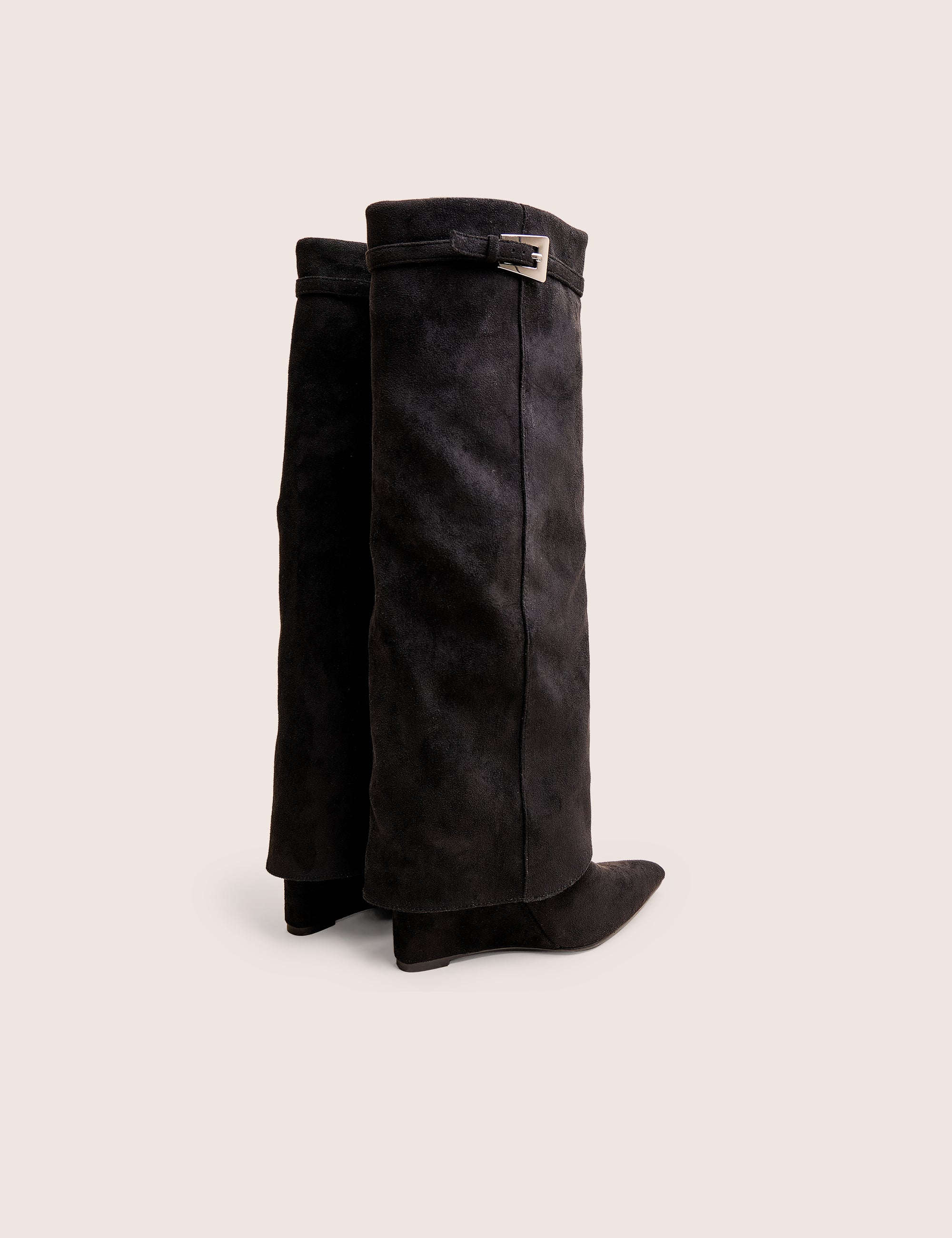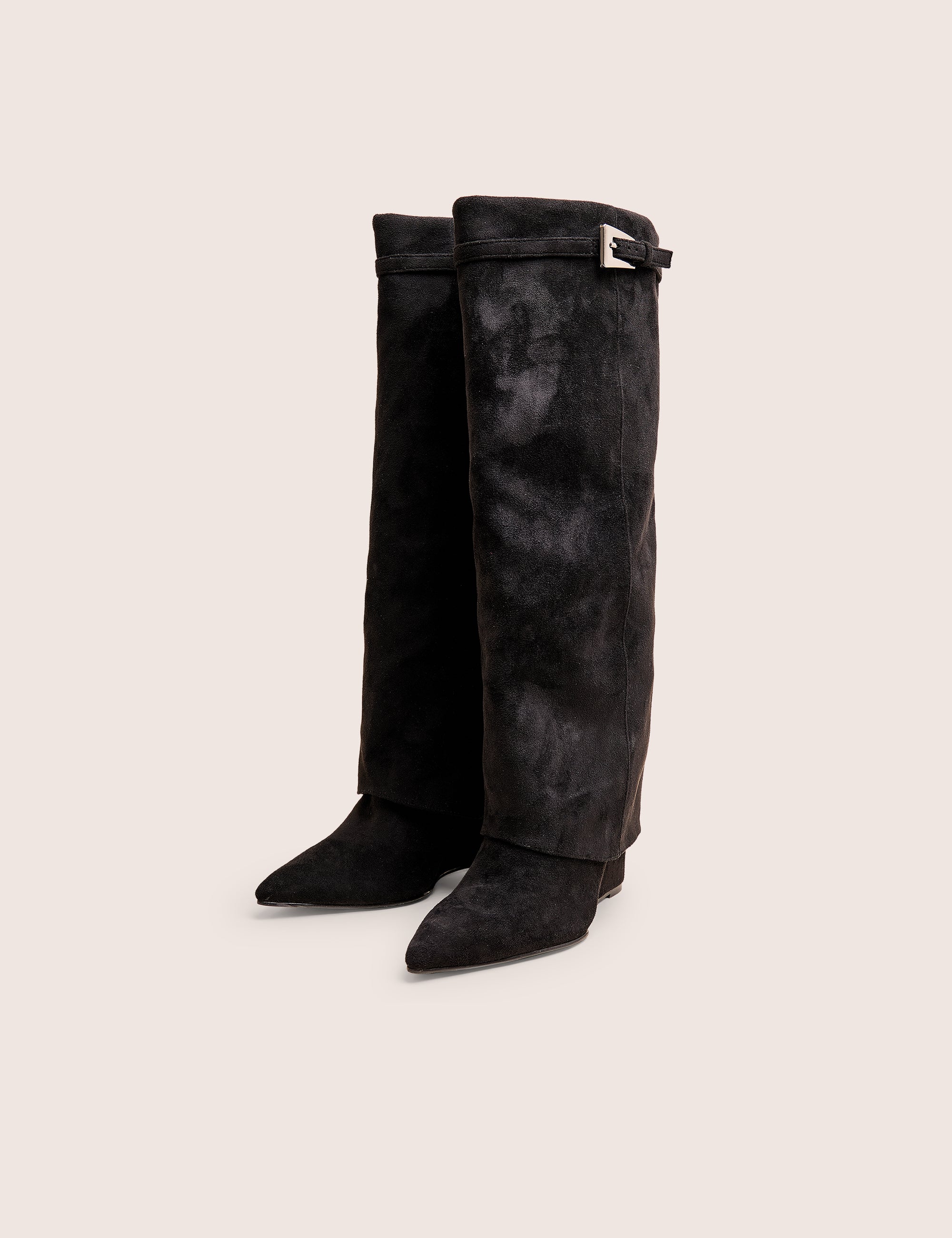 - Kola Black Fold Over Buckle Detail Heeled Boots