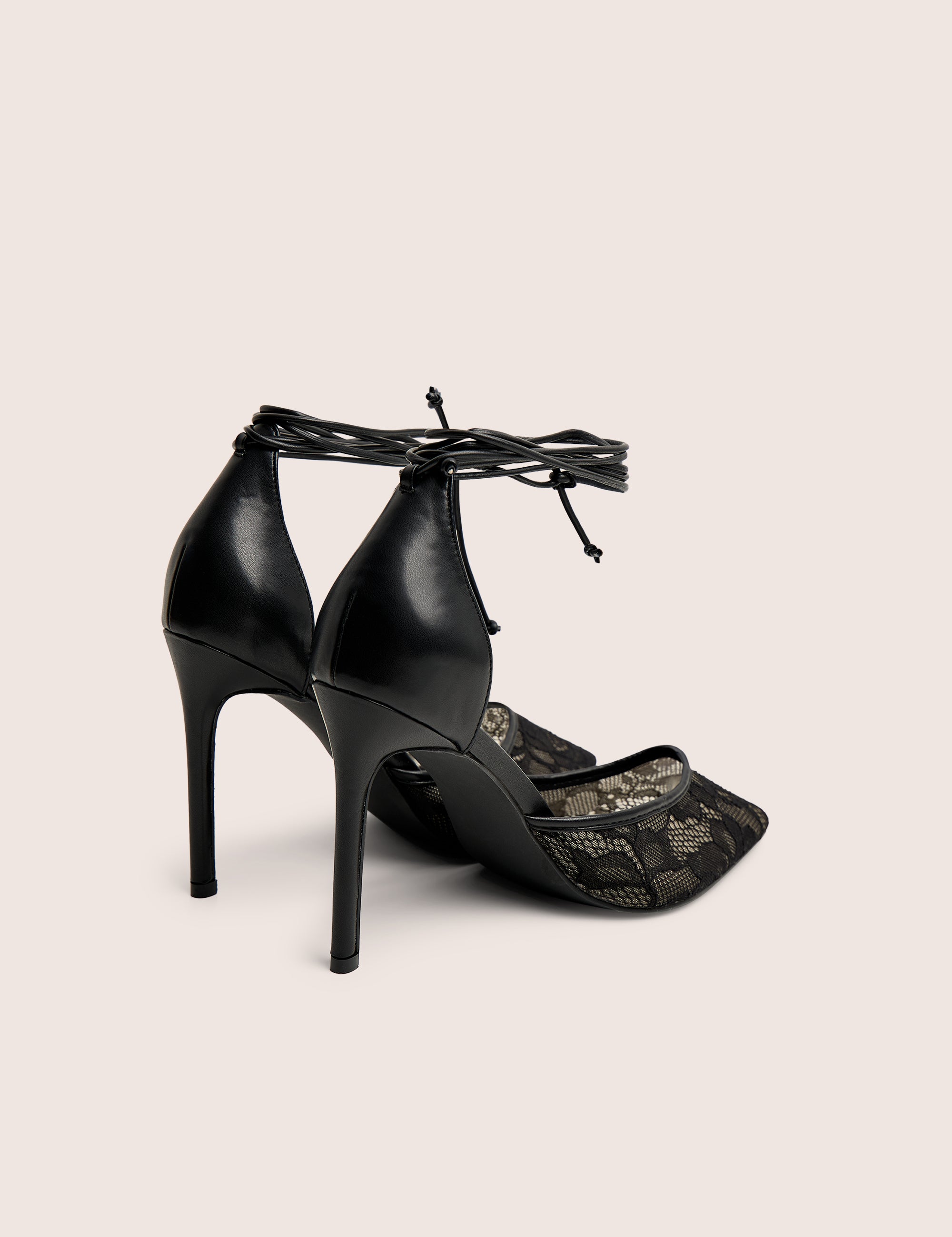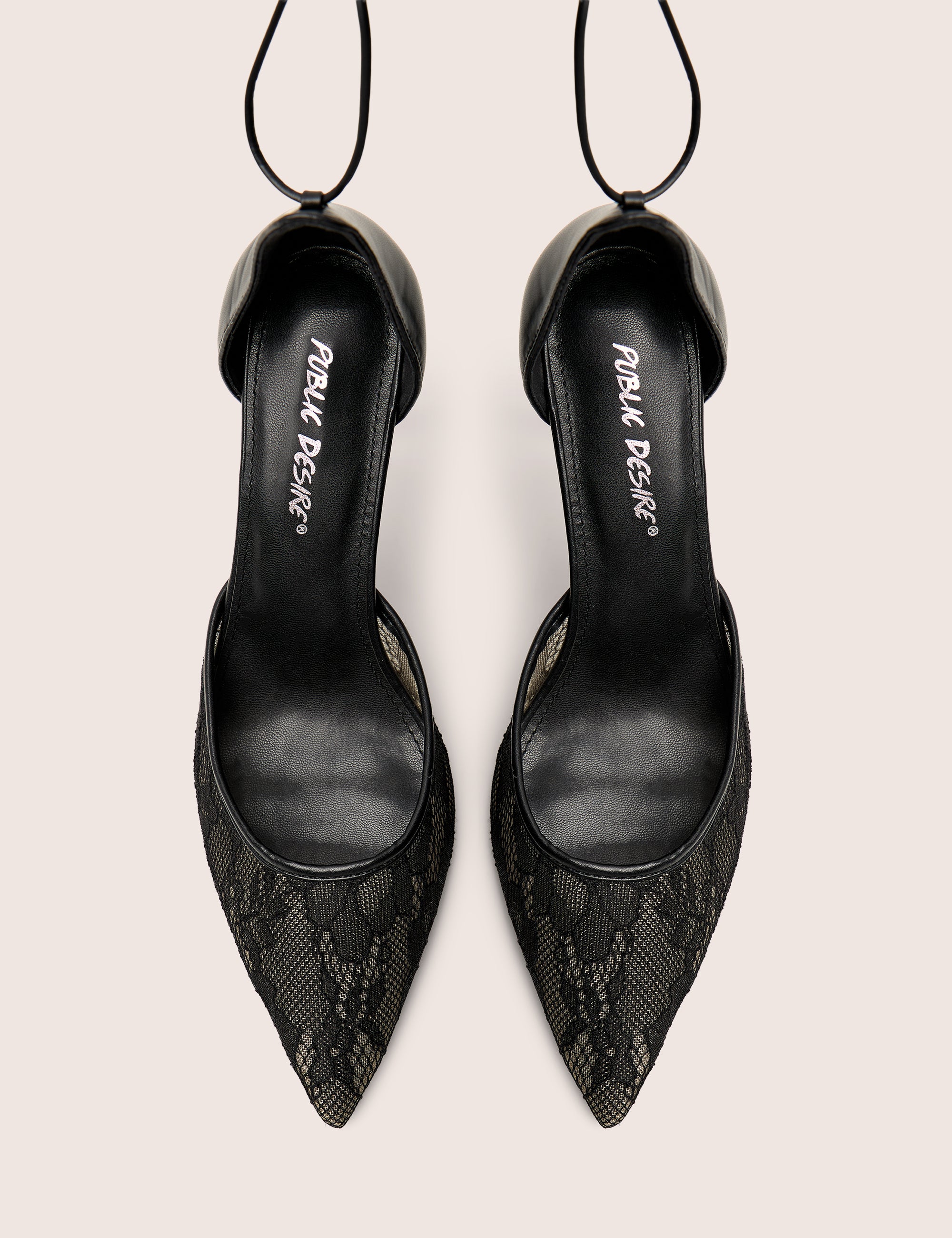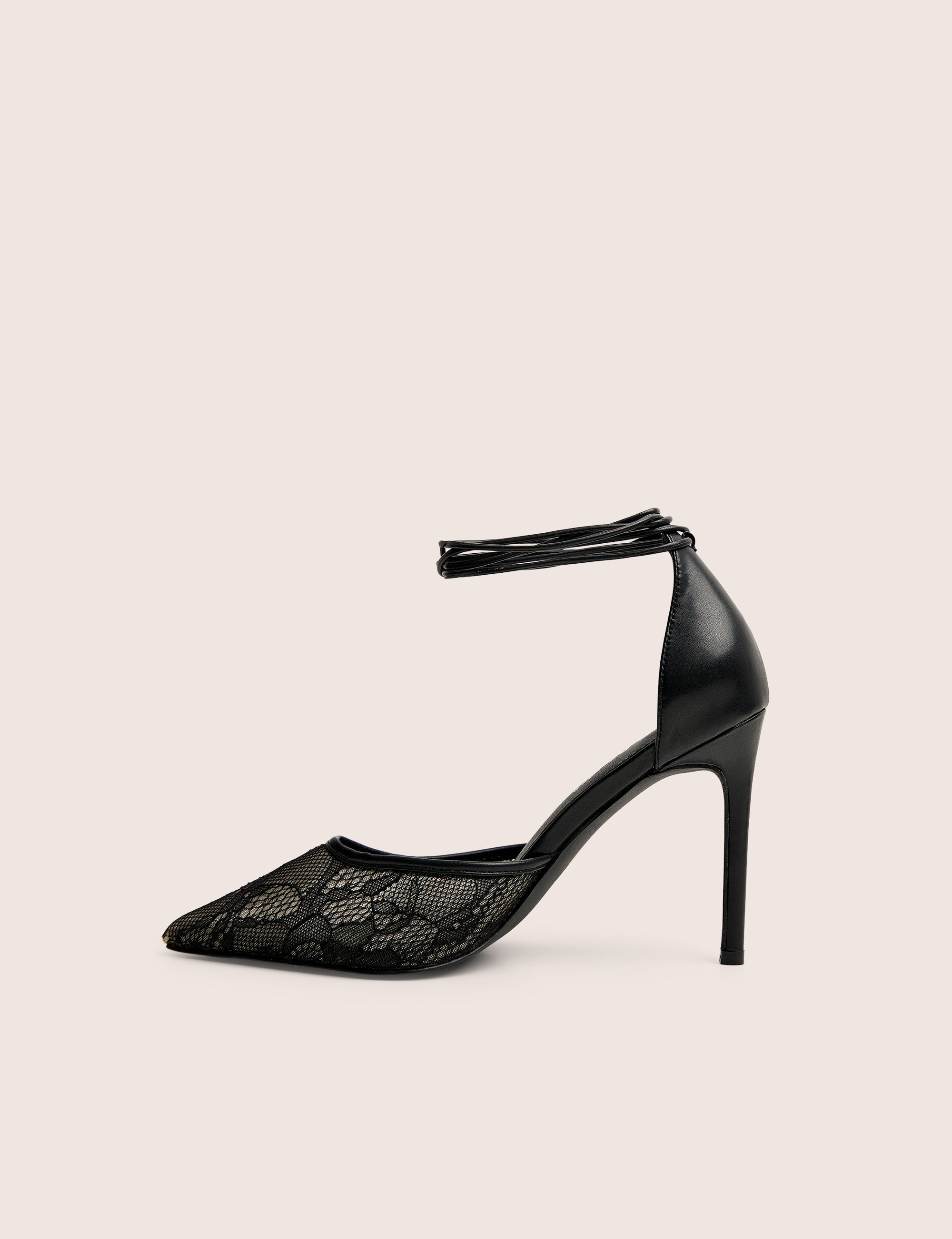 - Laced Up Black Lace Wrap Around Pointed Toe Heels
