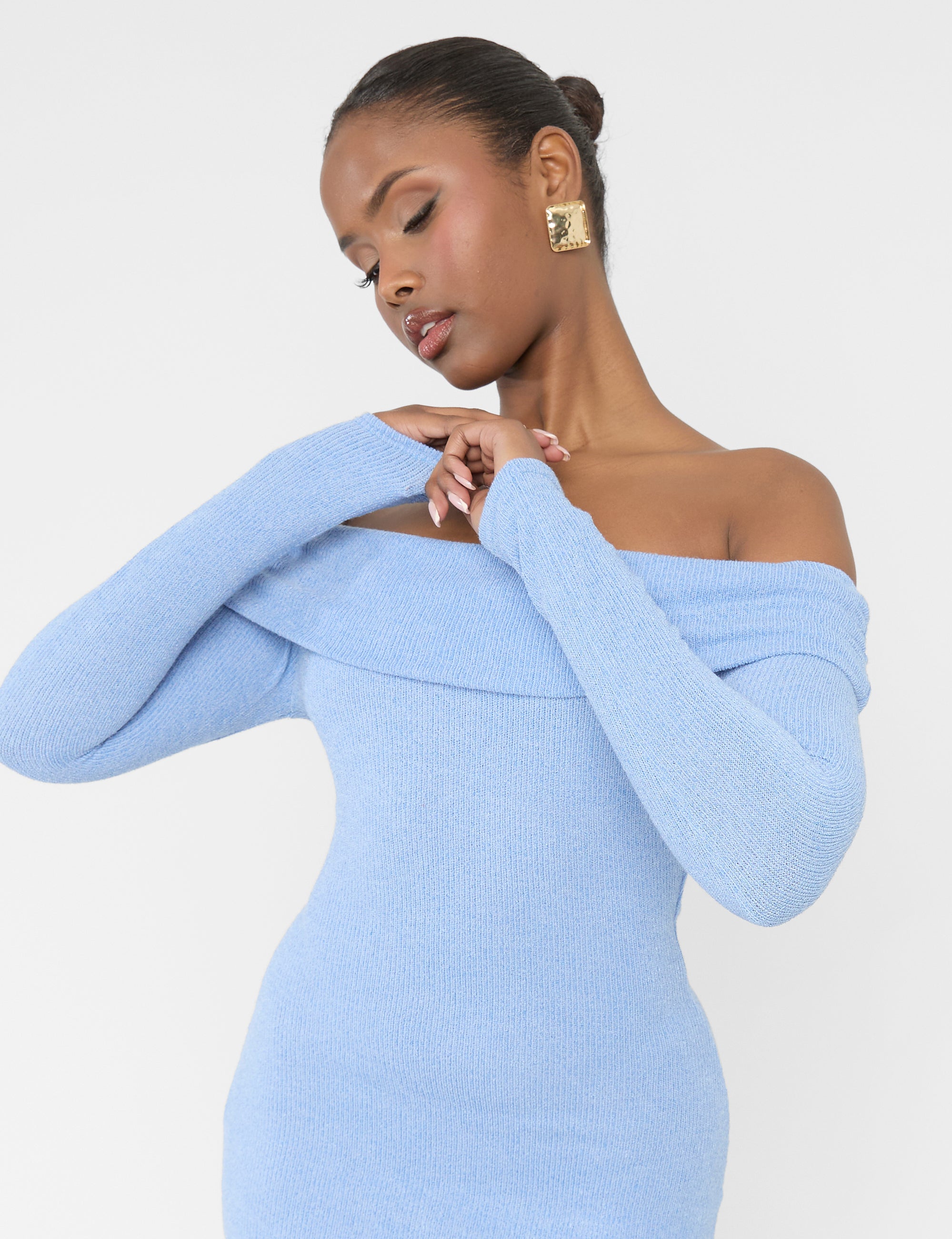 - Long Sleeve Off The Shoulder Bardot Mini Dress Blue