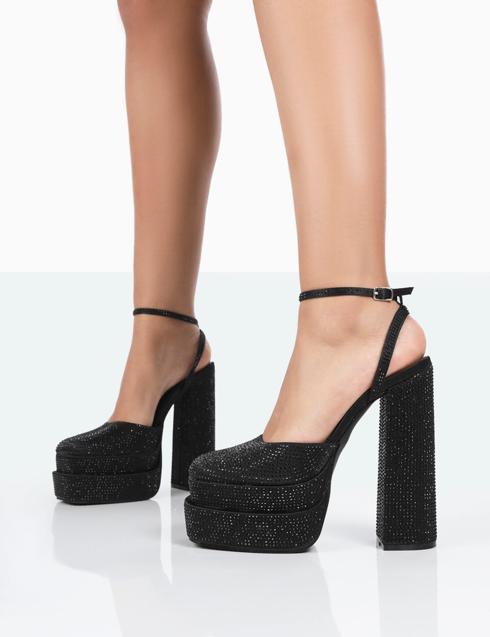- Moonchild Black Sparkly Diamanté Satin Closed Toe Platform Block Heels