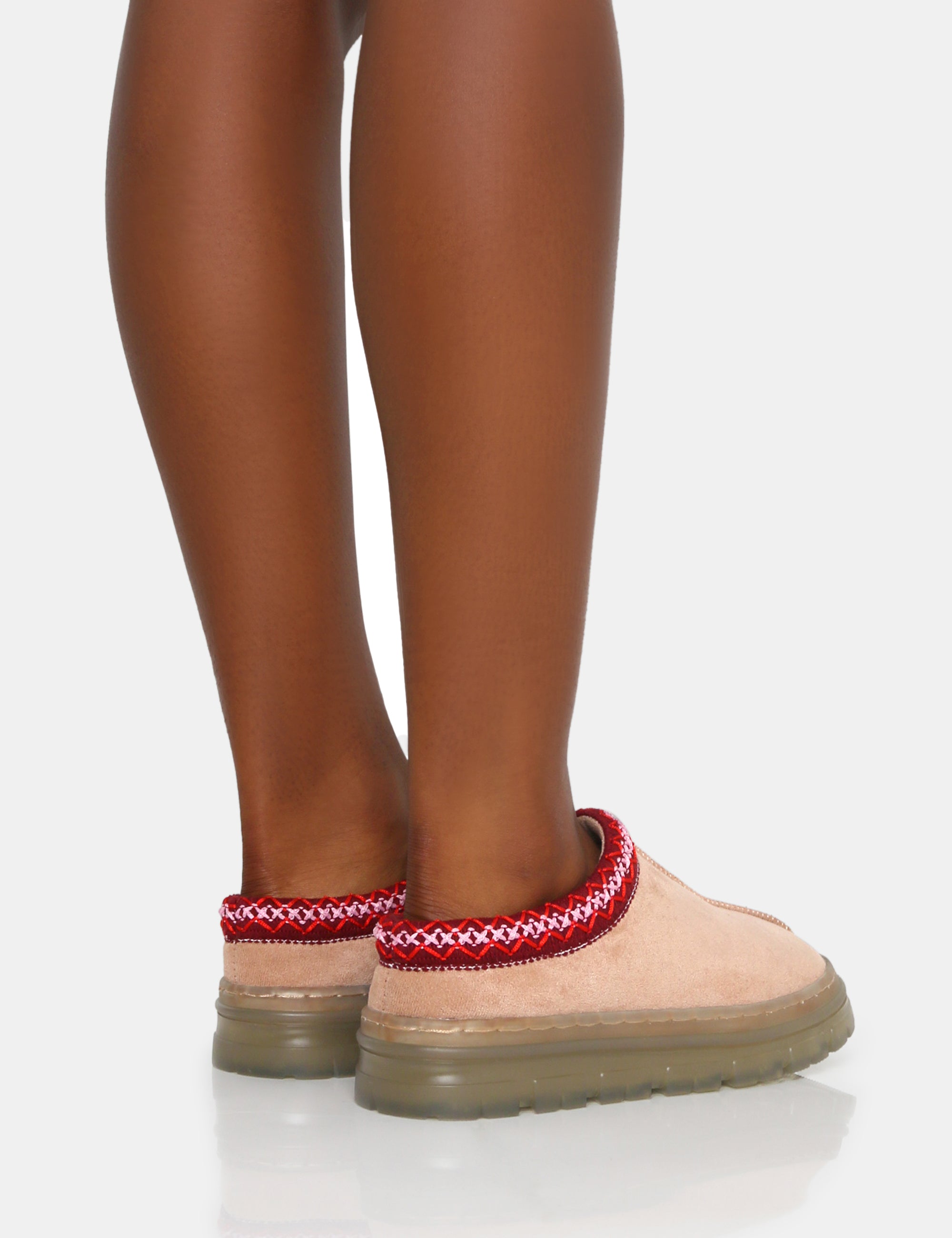 Take your look to the next level with this super soft, fashionable slipper-boot hybrid! With a trendy style Nala beige faux suede exterior, with striking embroidery on a platform sole - you'll be elevating your style like whoa. Slip into comfort and make some serious style statements!
