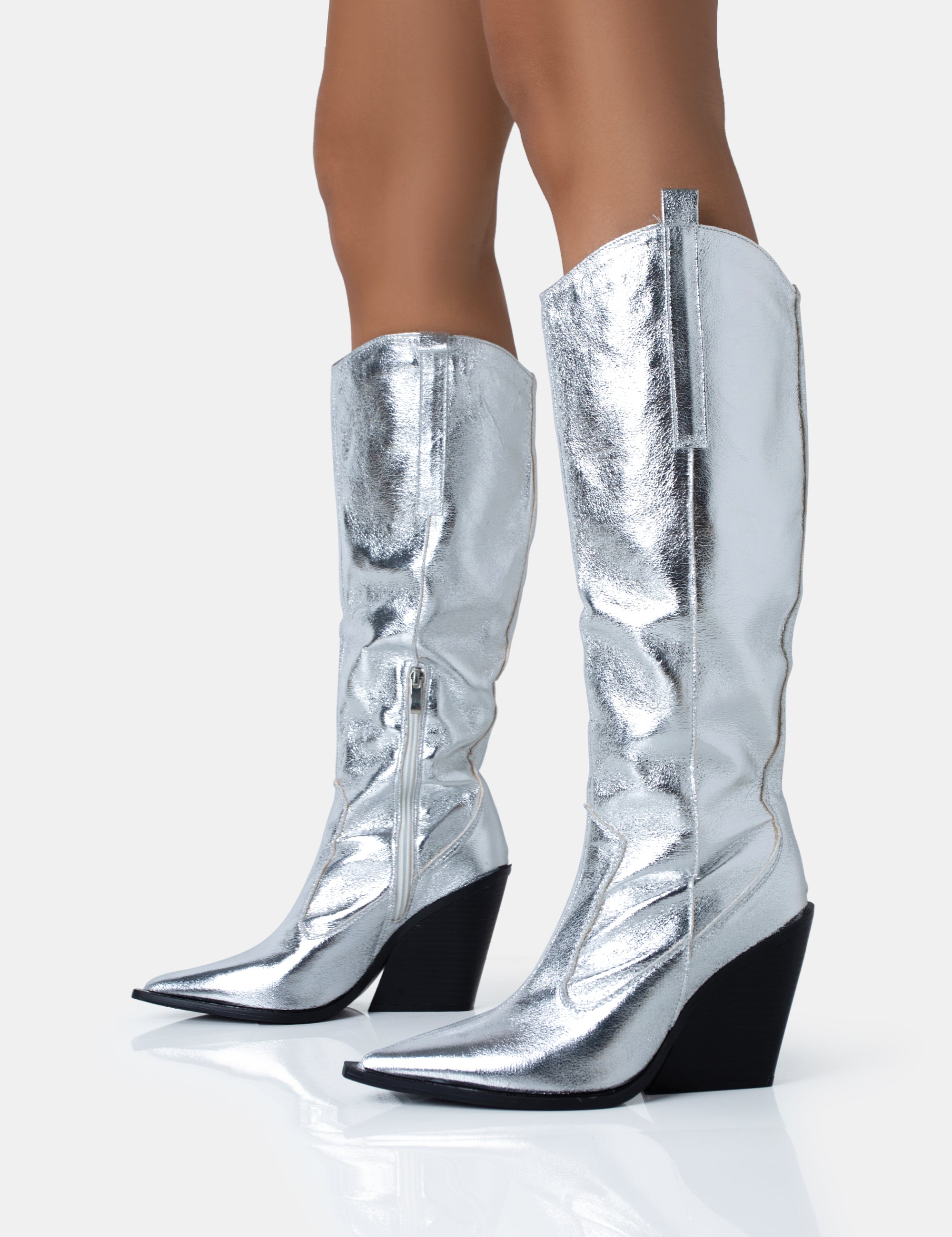 Nevada Silver Metallic Western Cowboy Block Heel Knee High Boots