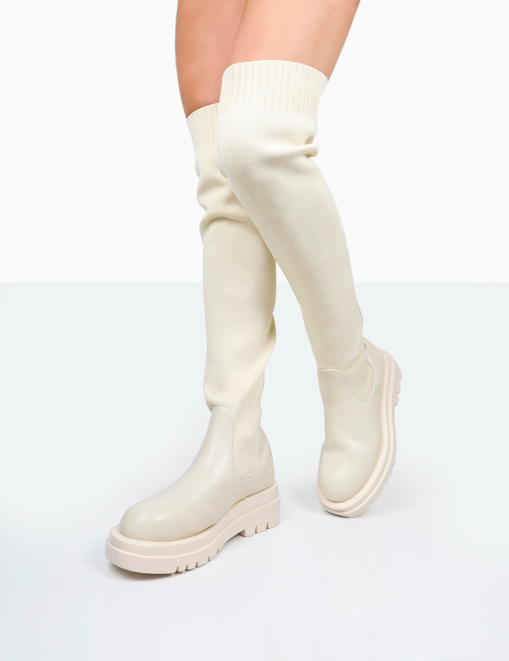 - New-Me Ecru Pu and Knit Over The Knee Chunky Sole Sock Fit Boots