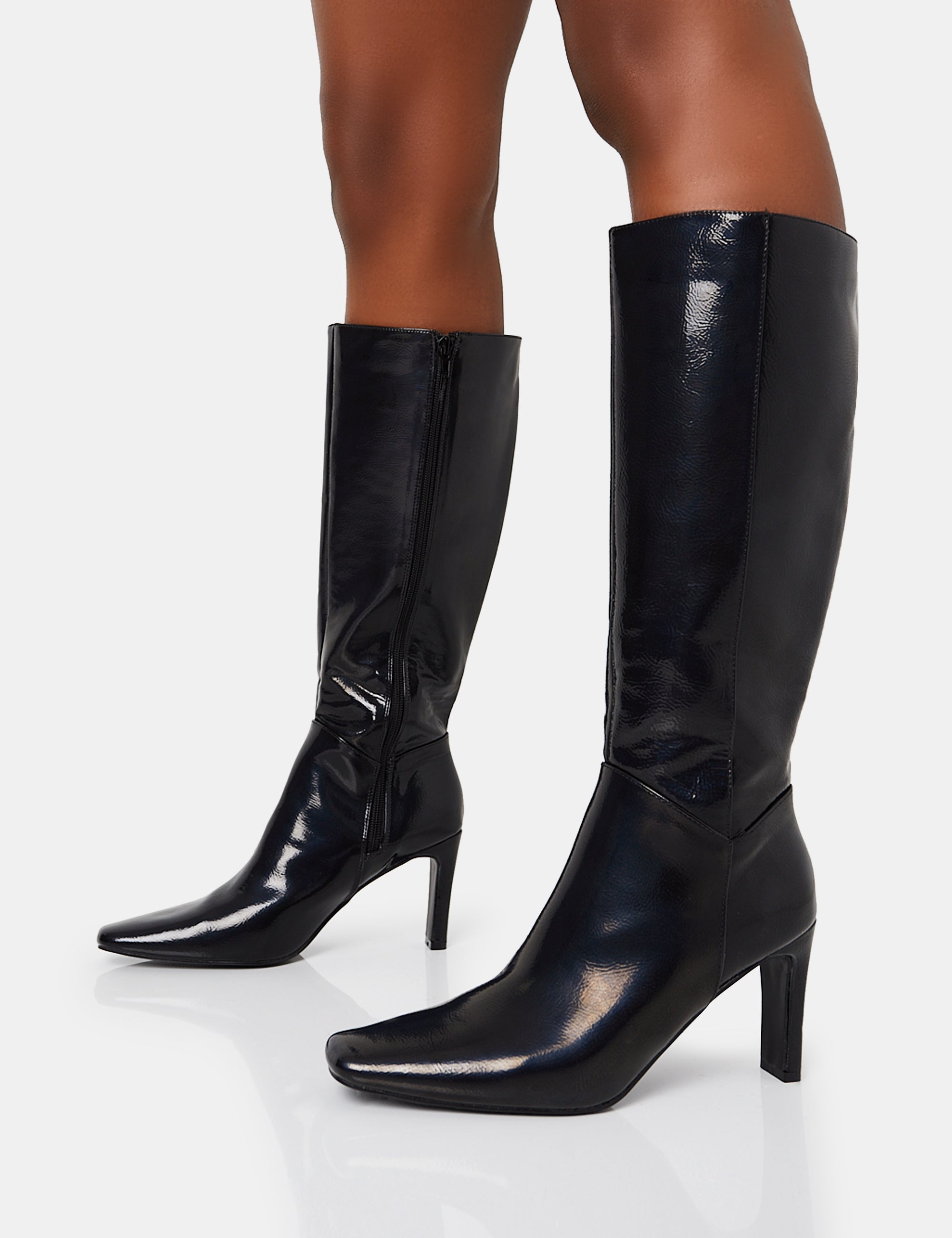 - Pose Black Textured Pu Zip Up Knee High Slim Block Heeled Boots