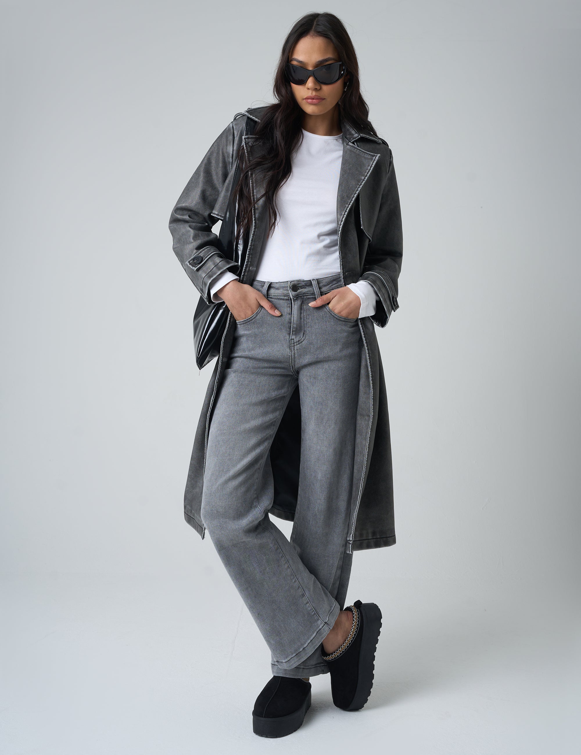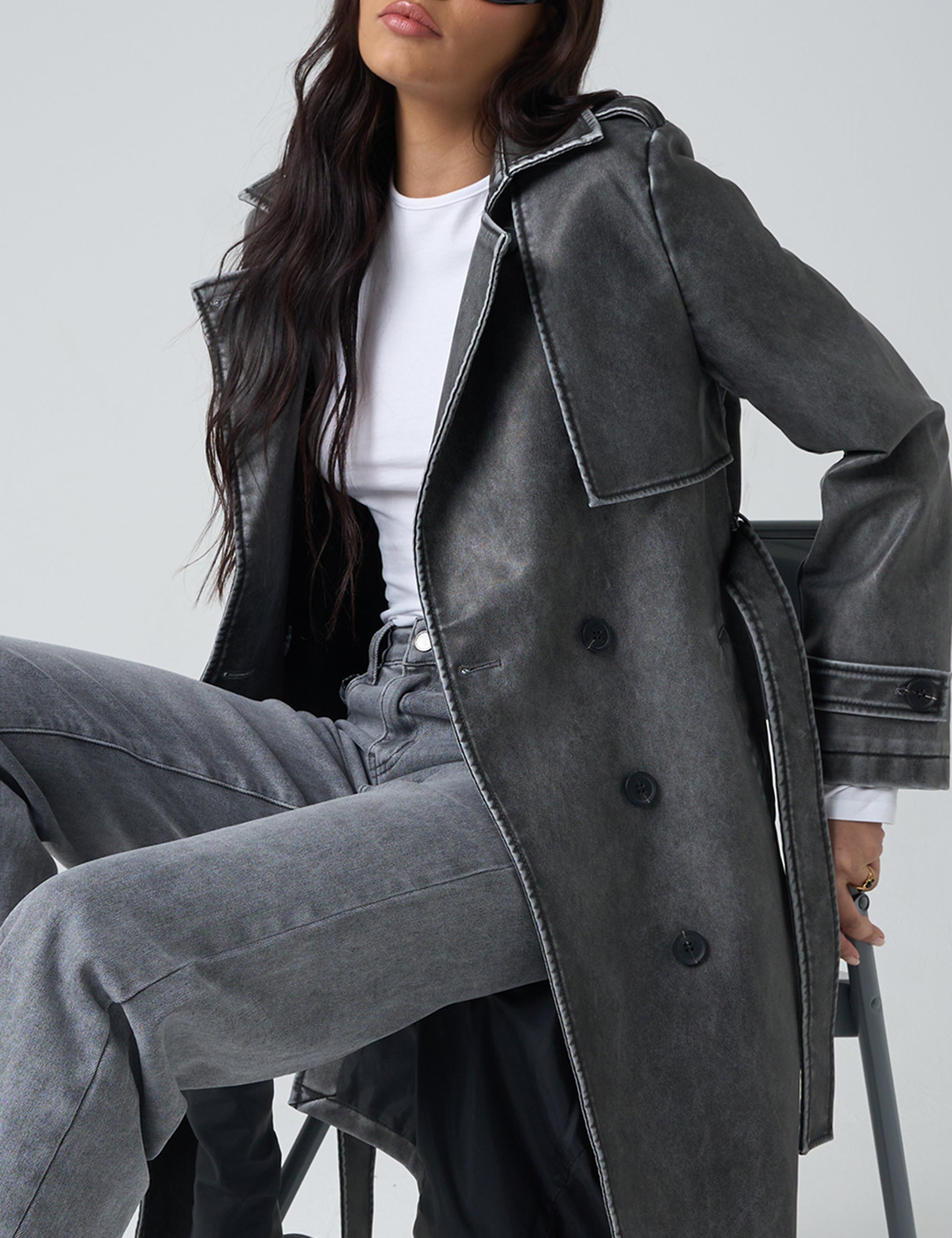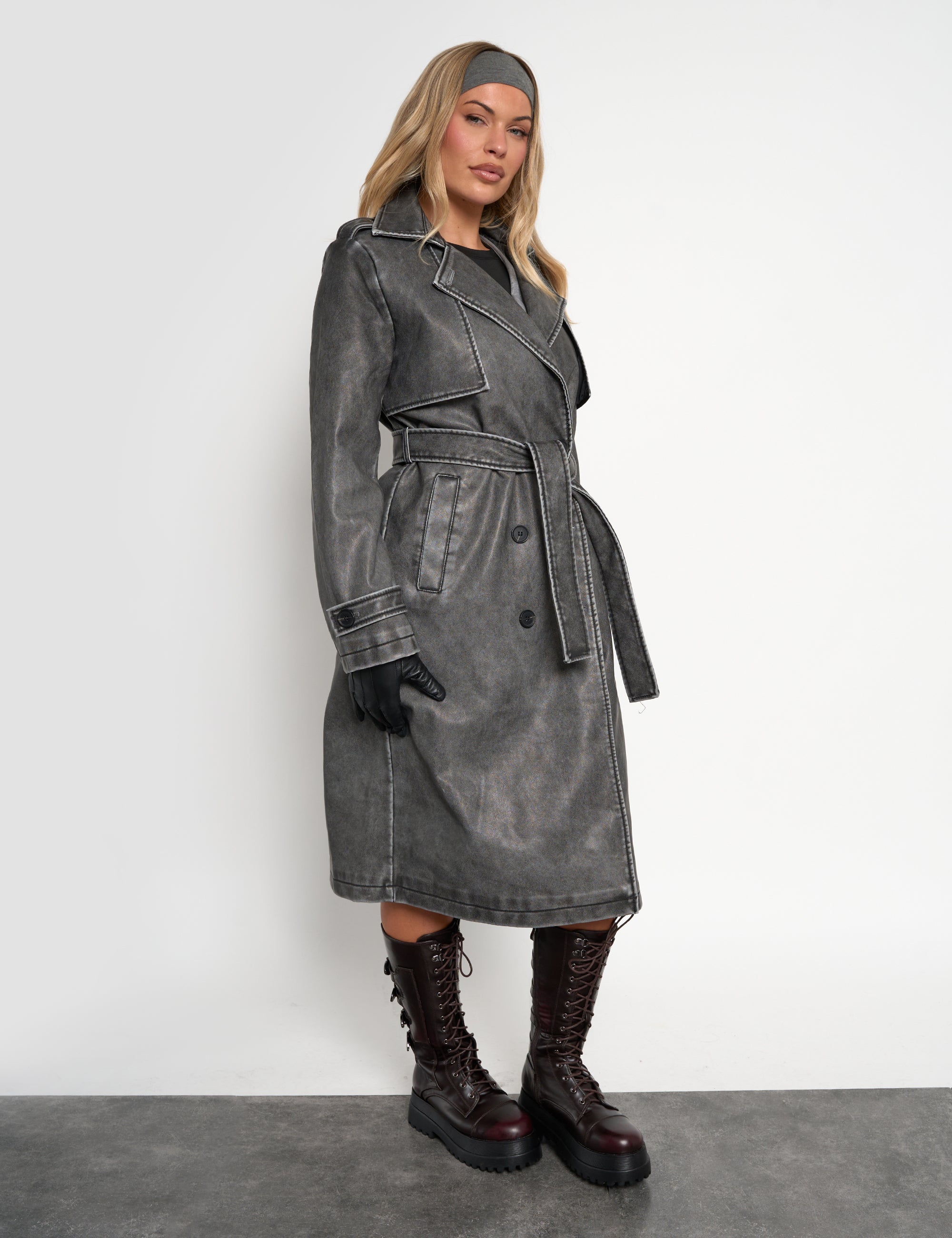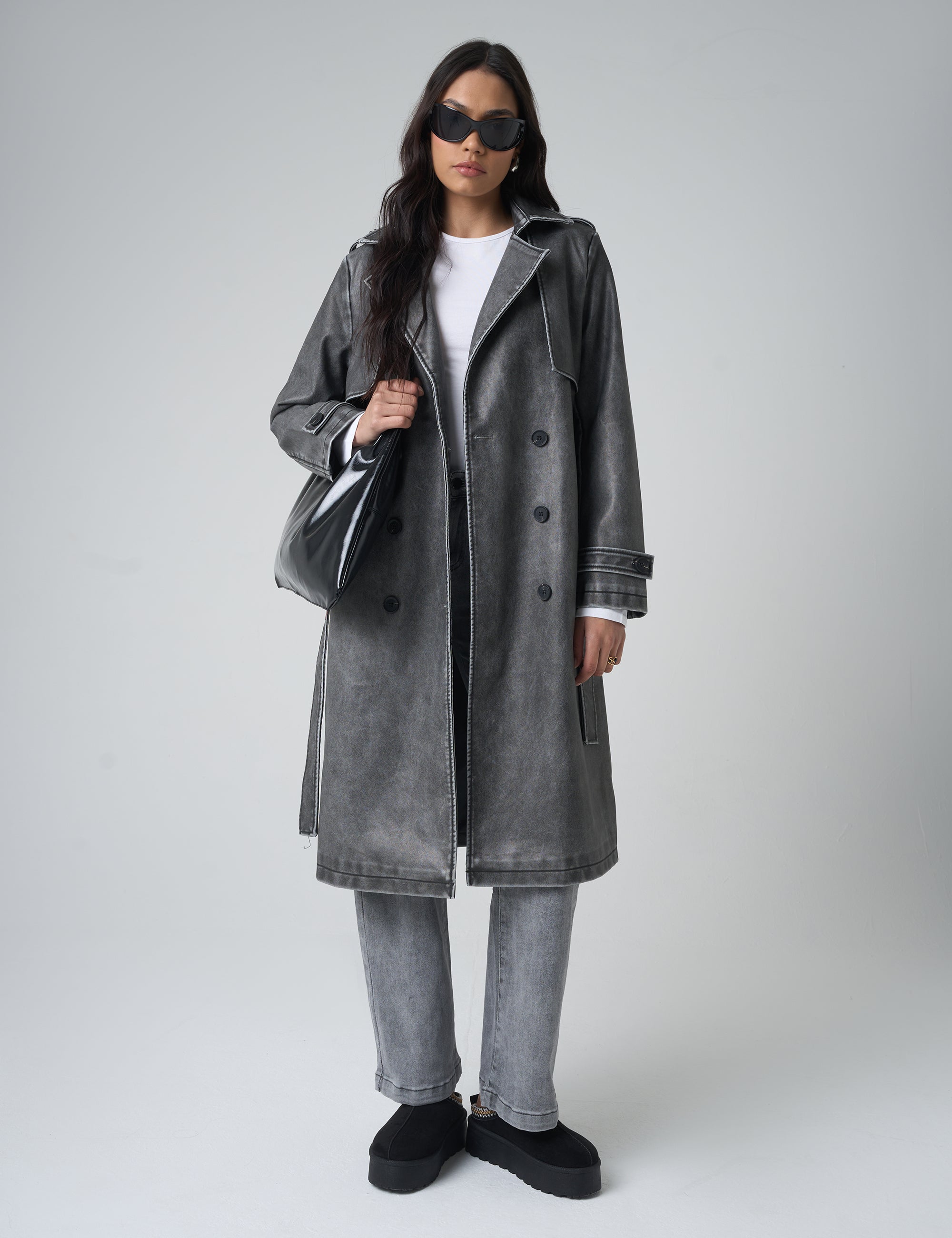 - Distressed Faux Leather Long Trench Coat Dark Grey