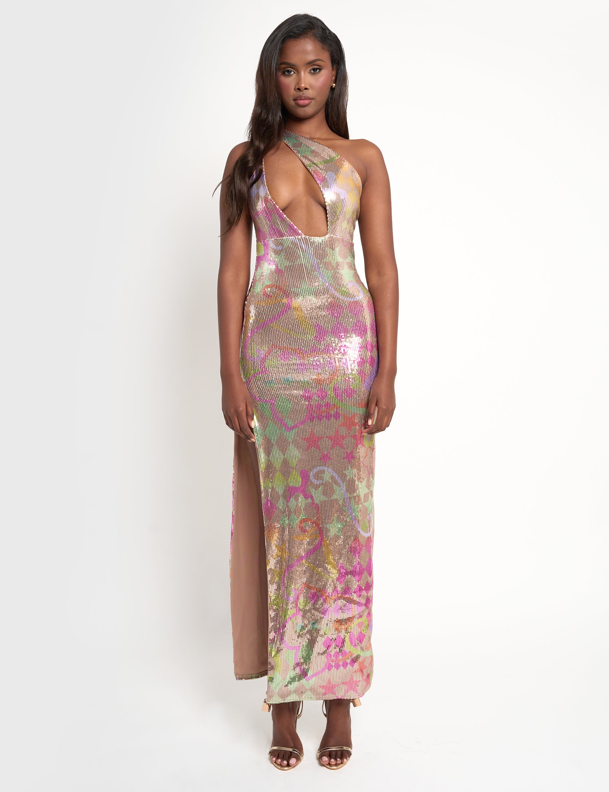 - Sequin Printed Asymmetric Maxi Dress Multi