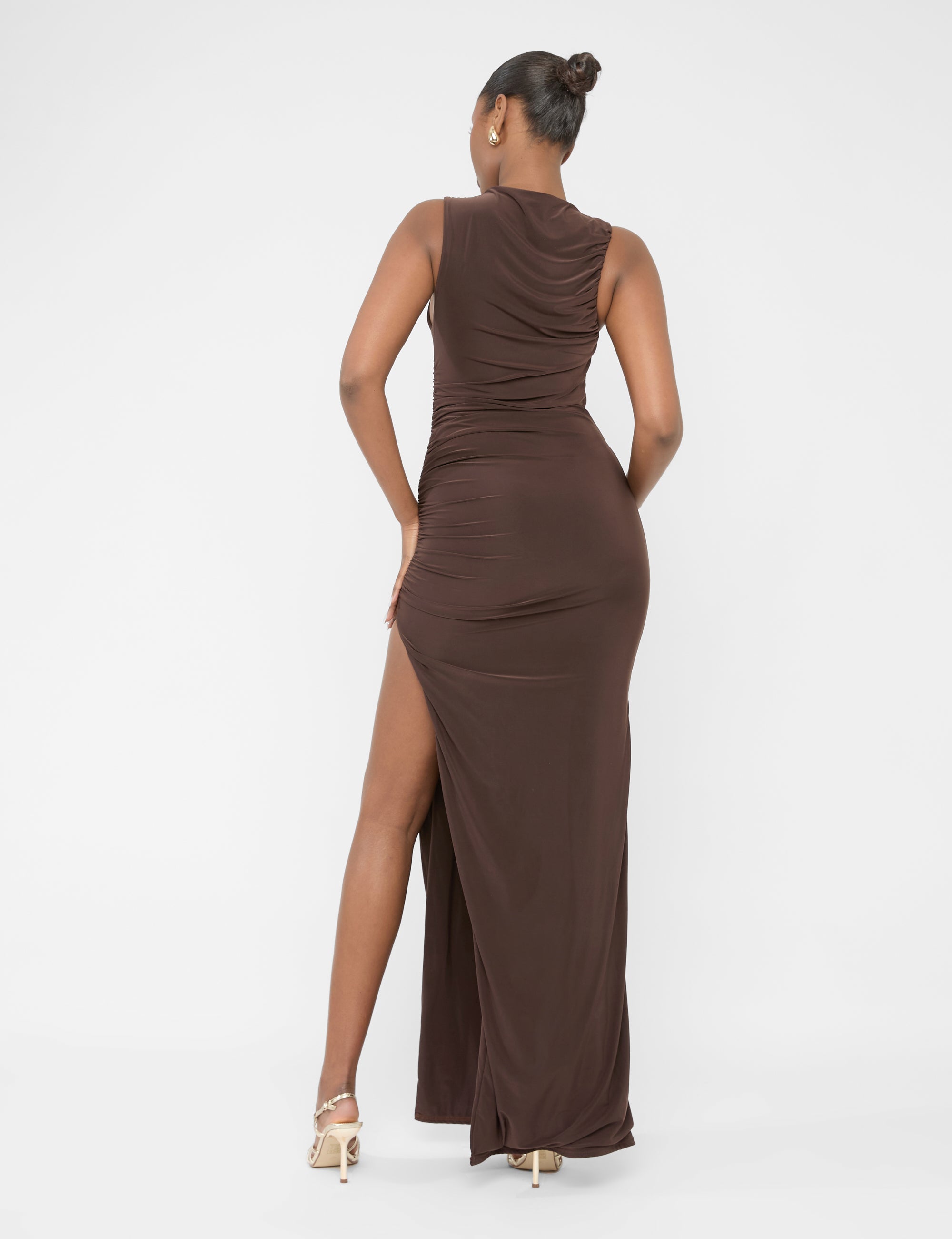 - High Neck Ruched Detail Maxi Dress Chocolate