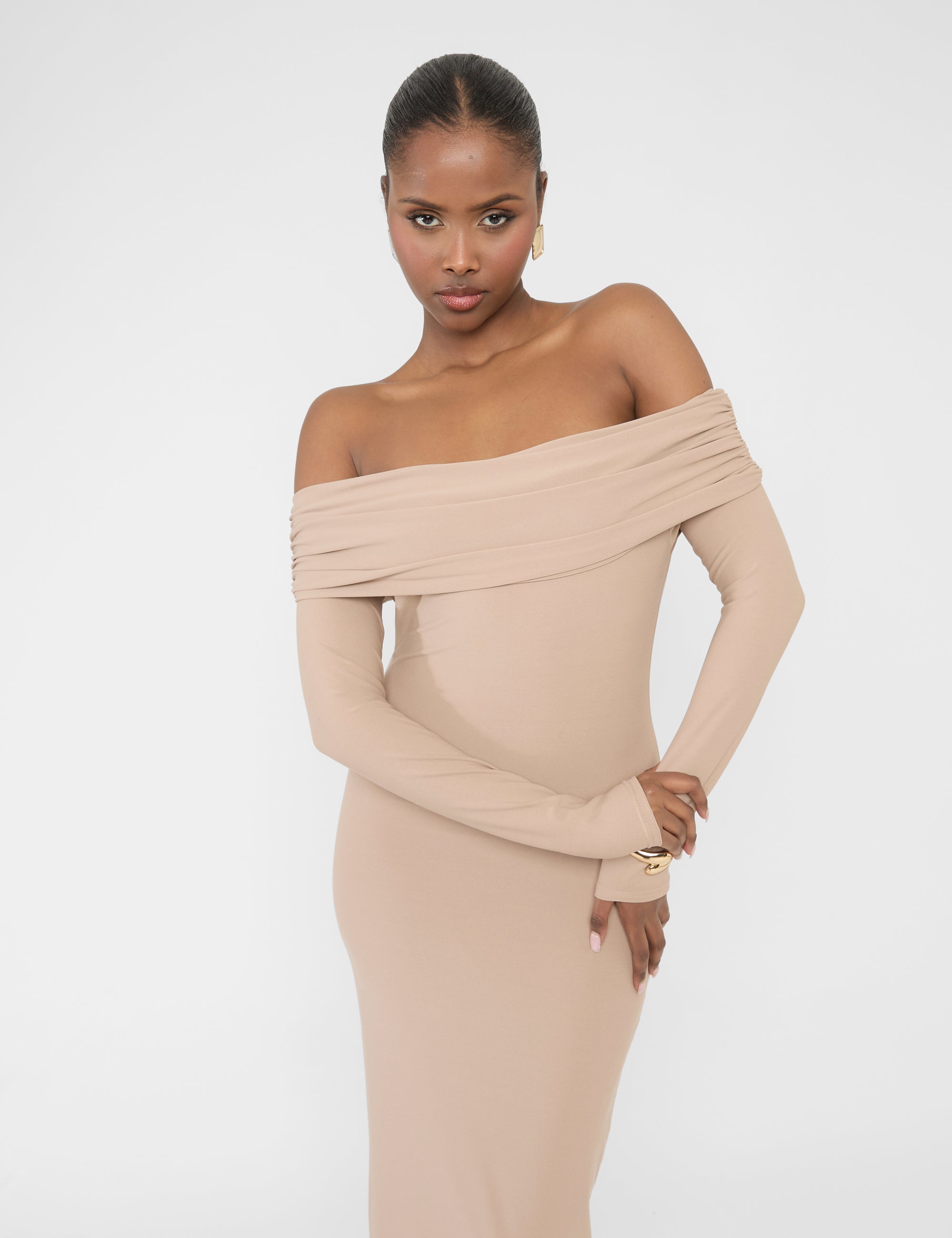 This slinky bardot maxi dress in latte is the perfect addition to your wardrobe for any occasion! With its elegant design and flattering fit, you'll feel confident and stylish no matter where you wear it. The soft and smooth fabric will keep you comfortable all day long, while the off-the-shoulder neckline adds a touch of glamour. Elevate your style with the Slinky Bardot Maxi Dress in Latte!