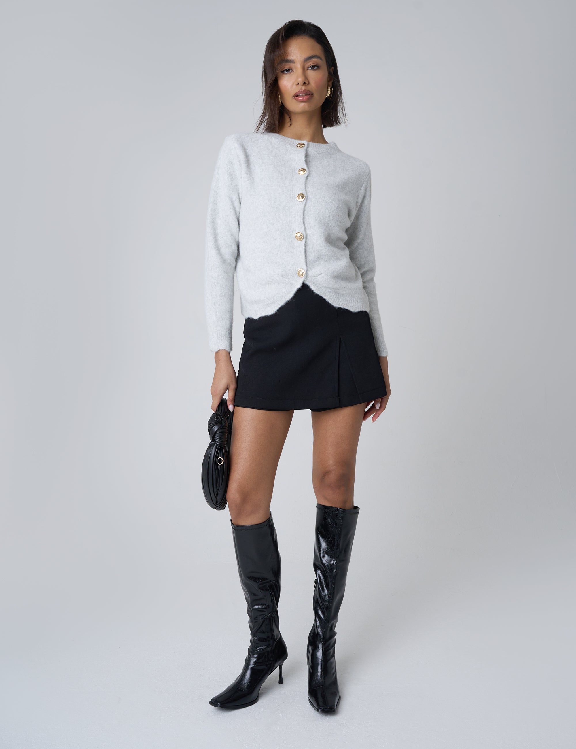 Elevate your style with our Gold Button Detail Knit Cardigan in grey! With stunning gold buttons and a comfortable knit fabric, this jumper effortlessly adds a touch of elegance to any outfit. Perfect for cool weather, it will keep you cozy and stylish all day long. Upgrade your wardrobe with this must-have piece now!