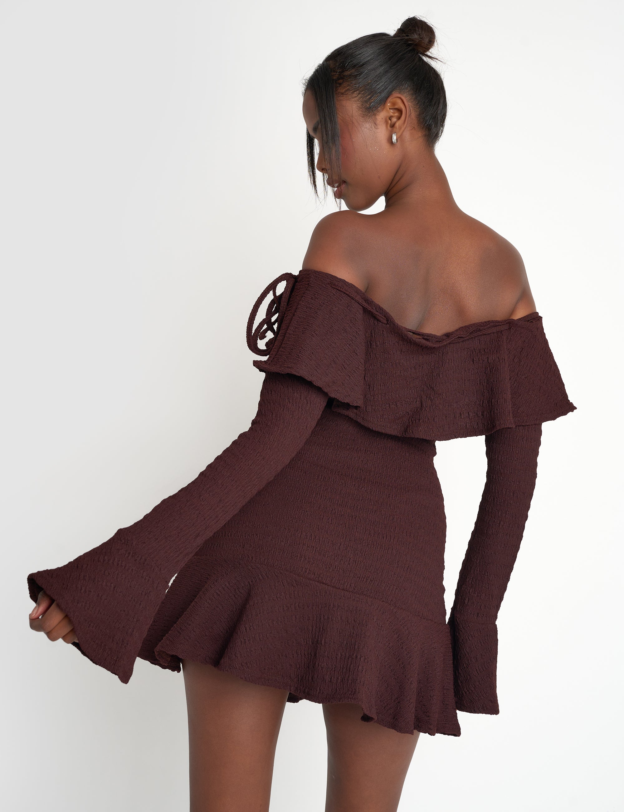 Indulge in the rich, decadent color and luxurious texture of our Textured Bardot Mini Dress in Chocolate. This dress is designed to flatter and enhance your natural curves, while the deep brown hue exudes elegance and sophistication. Perfect for any special occasion or a night out on the town.