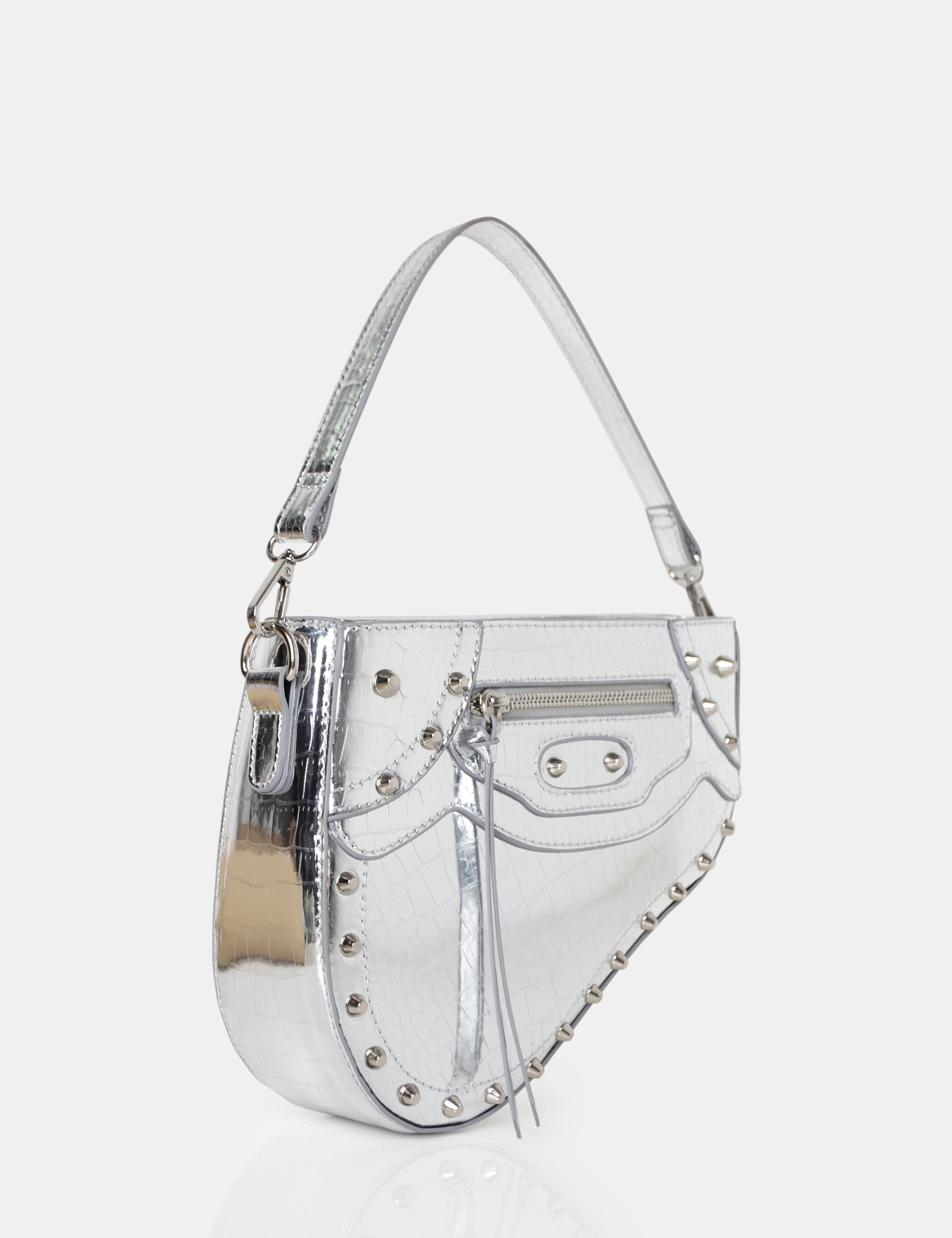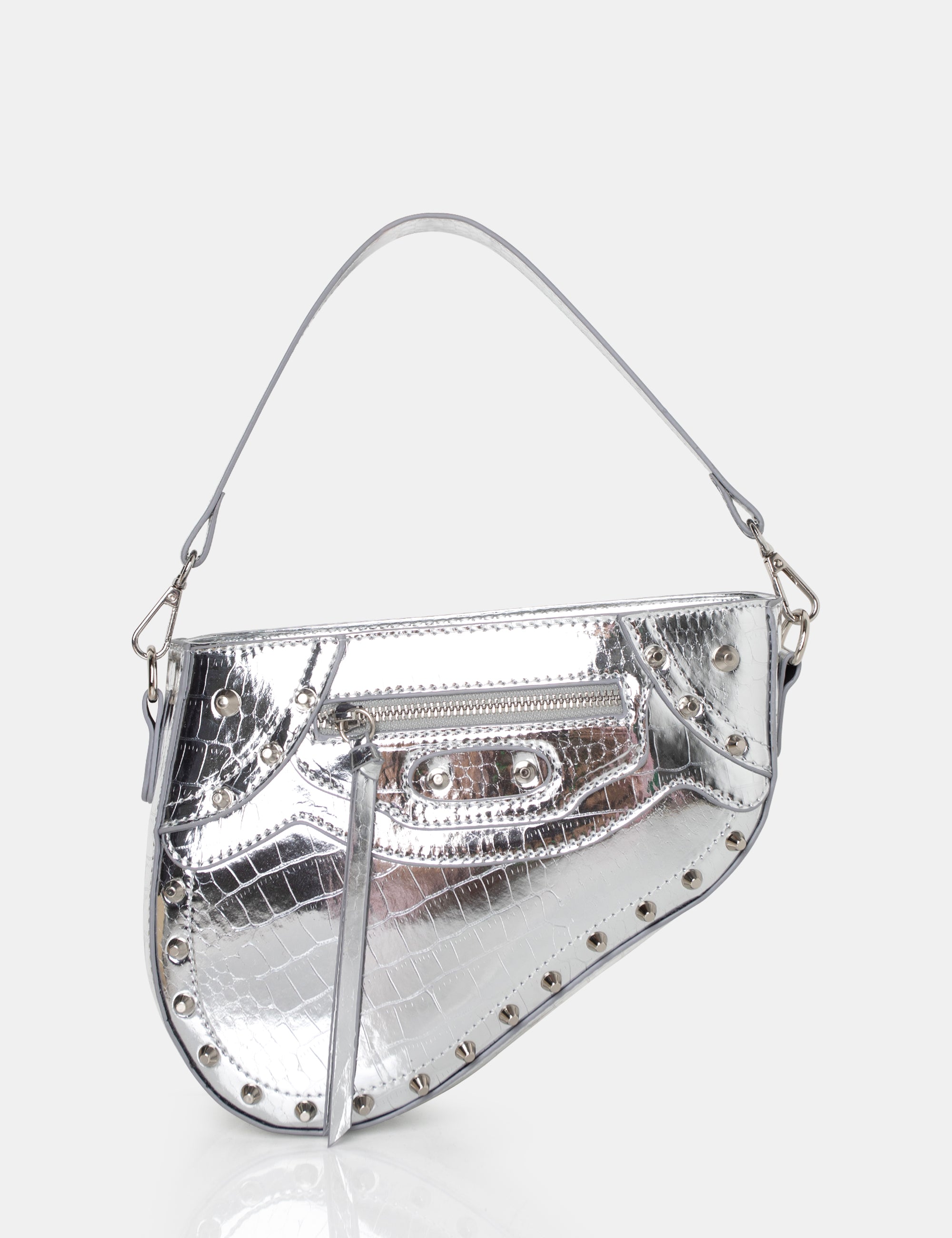 The Fox Metallic Silver Croc Studded Saddle Shoulder Bag