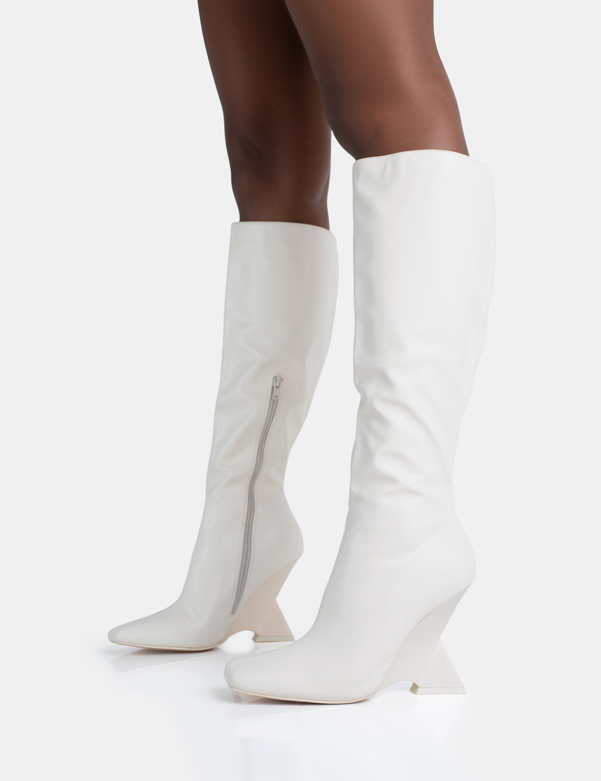 Vanessa Ecru PU Inverted Wedge Square Toe Heeled Knee High Boots
