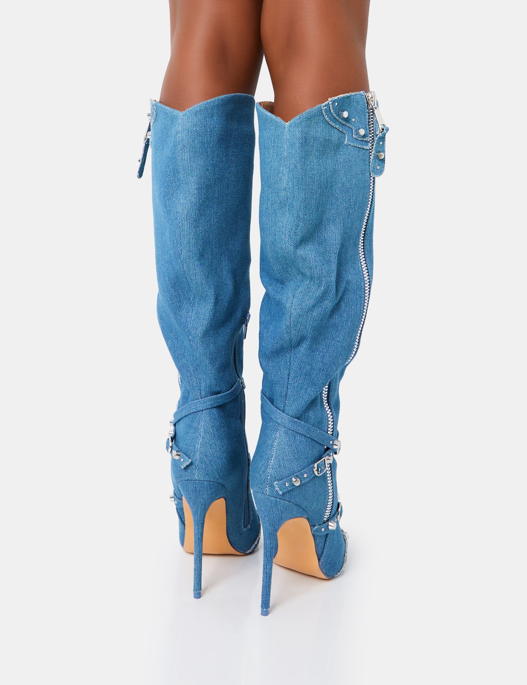 Worthy Blue Denim Studded Zip Detail Pointed Stiletto Knee High Boots