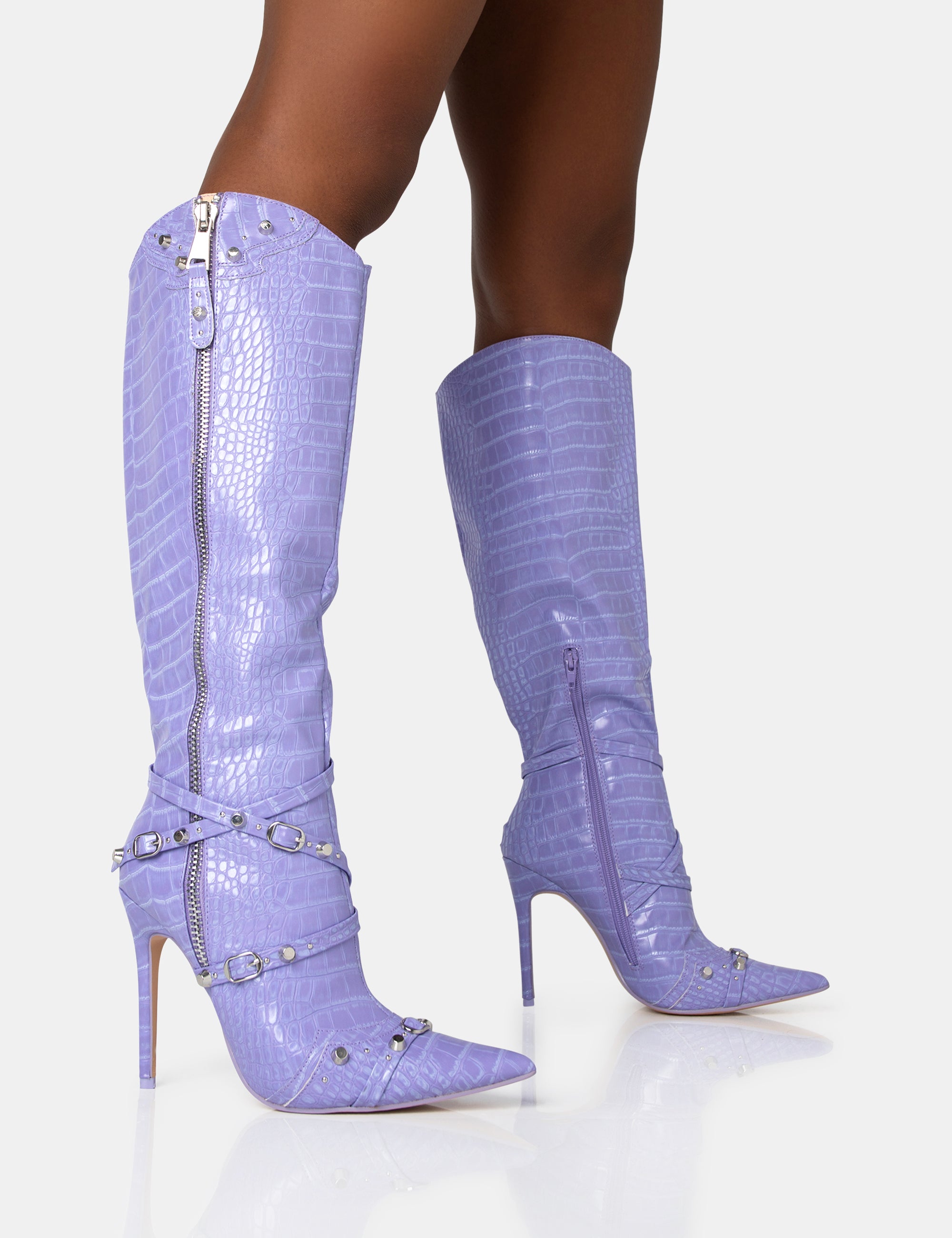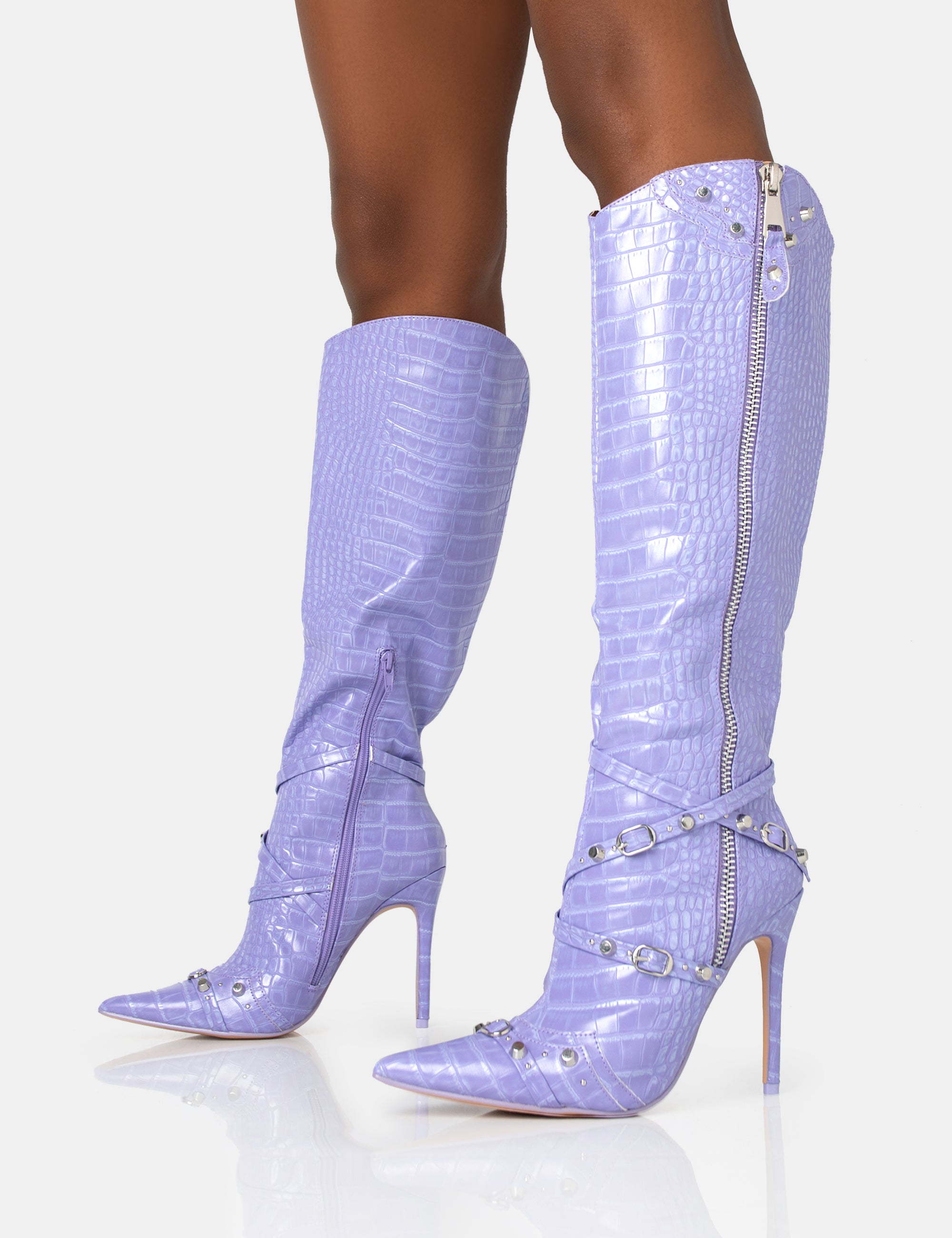 - Worthy Lilac Croc Studded Zip Detail Pointed Toe Stiletto Knee High Boots